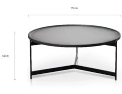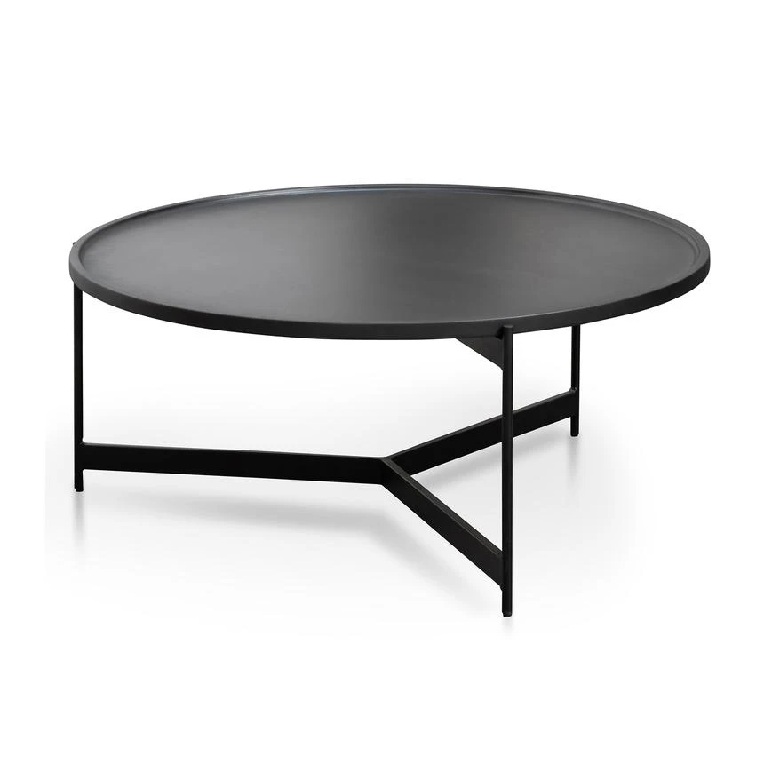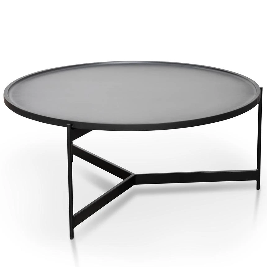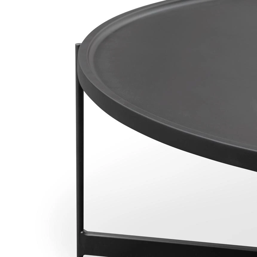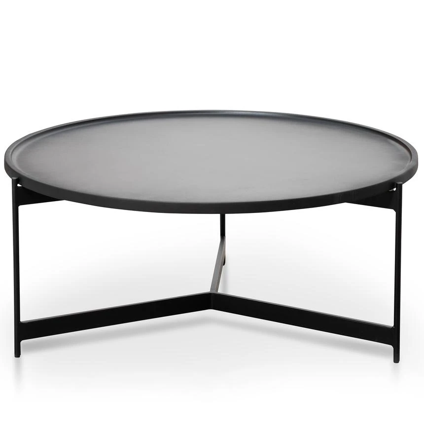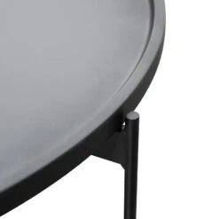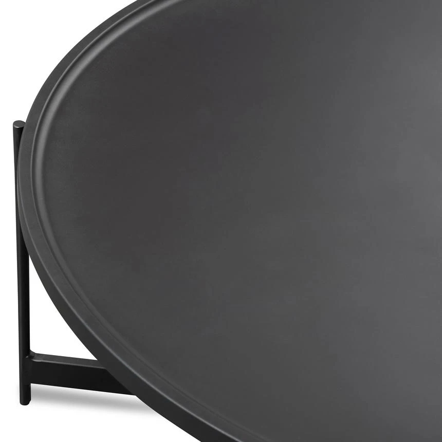 Round MDF table top in a matte black finish sits on top frame Steel tri-base in matte black for lasting strength and stability Slight lipped edge adds a subtle design element Feet protectors included to prevent slipping or scuffing