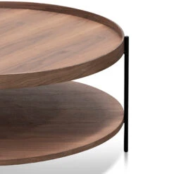 Engineered wood with walnut veneer construction Matte black metal tripod frame Two-tiered design with a circular shelf Weight limit of 100 kg Product is flat packed and requires two-person assembly