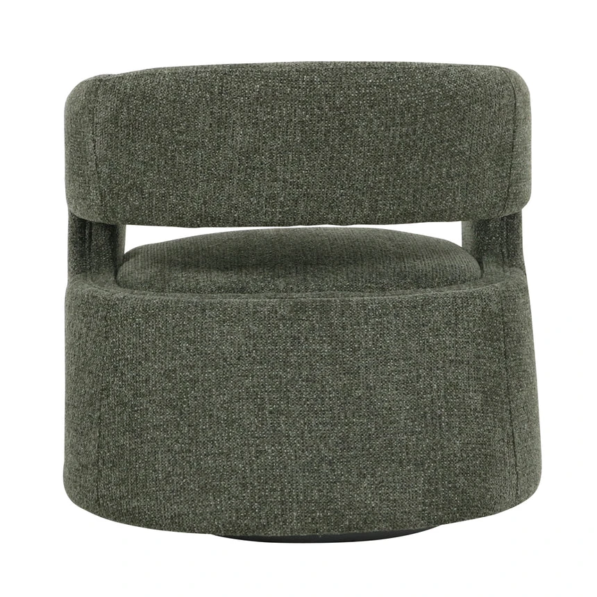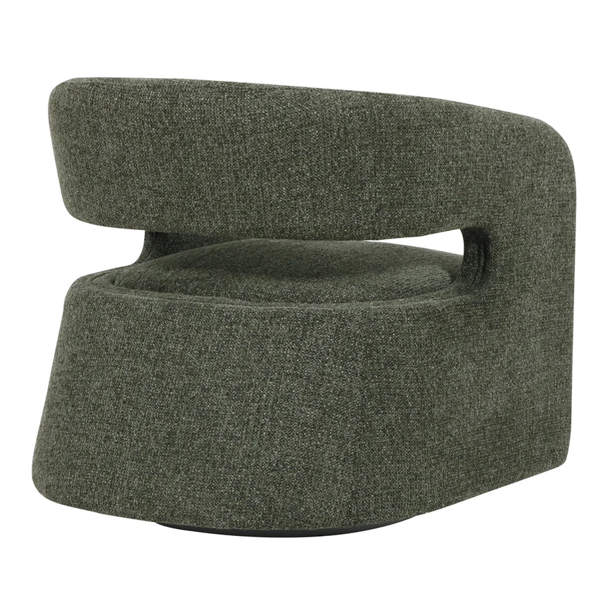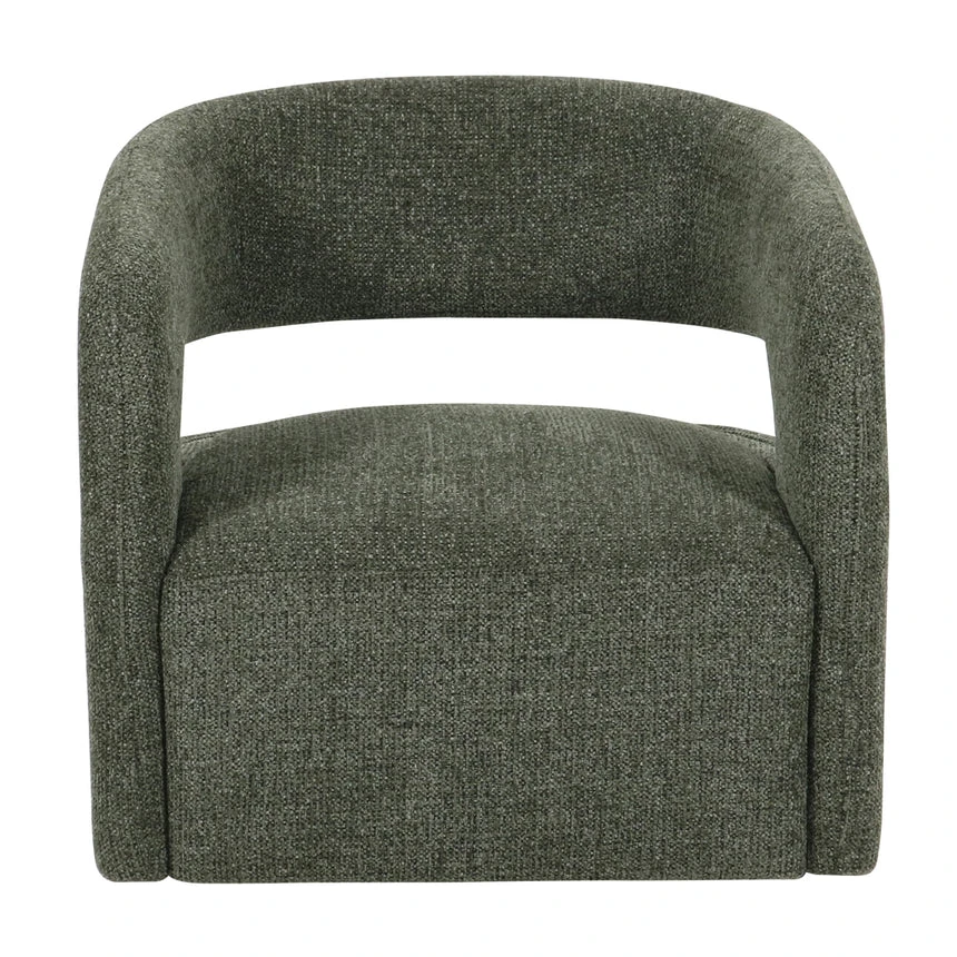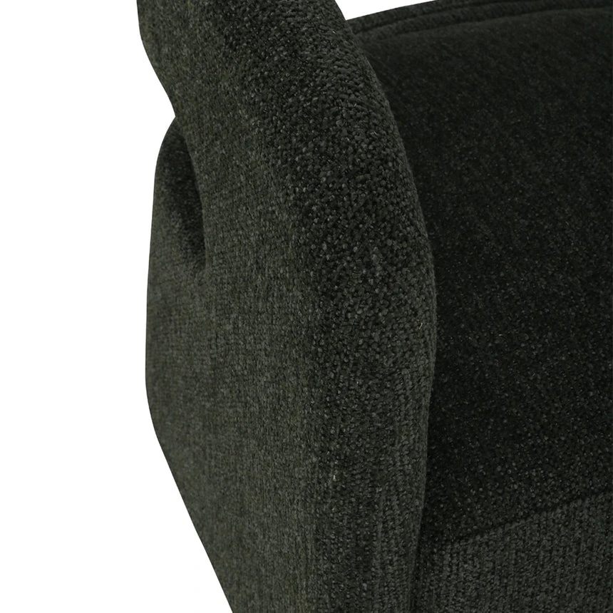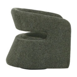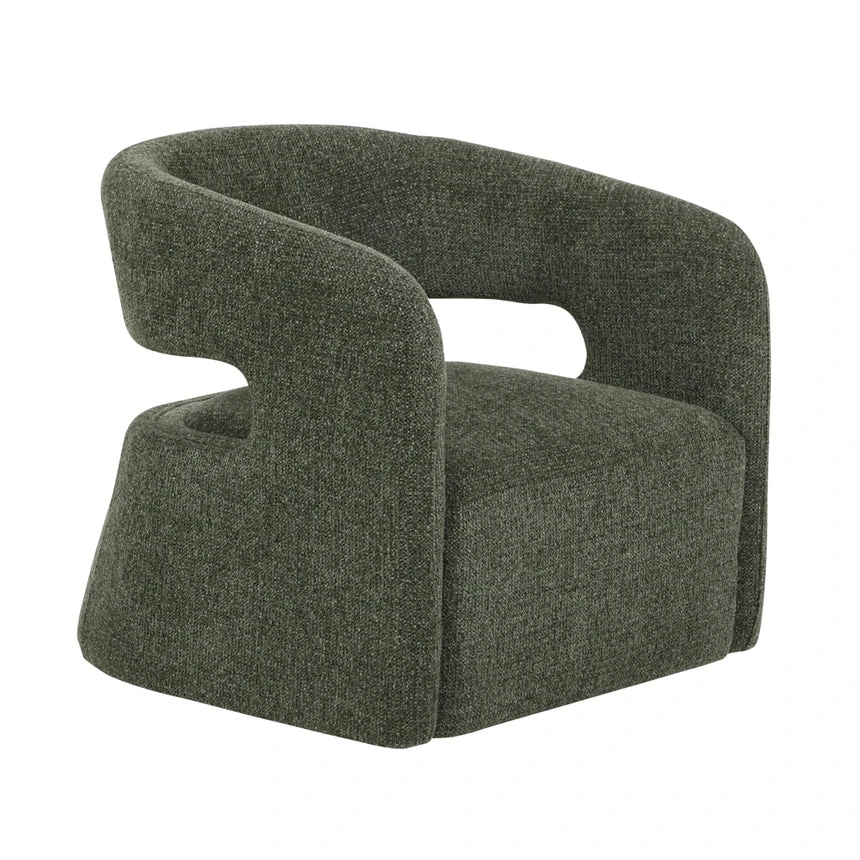 Coral dark green polyester upholstery Pinewood and plywood frame Medium seat firmness Web and spring suspension Metal legs with floor protectors Modern design with open-back detail Ergonomic seat Weight Capacity: 120 kg Product comes fully assembled