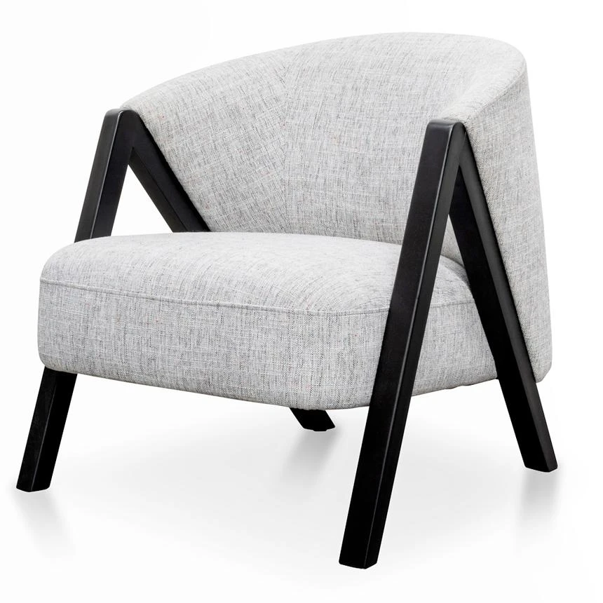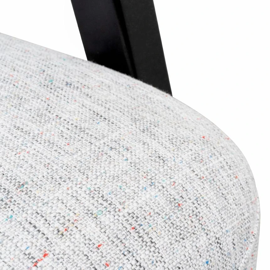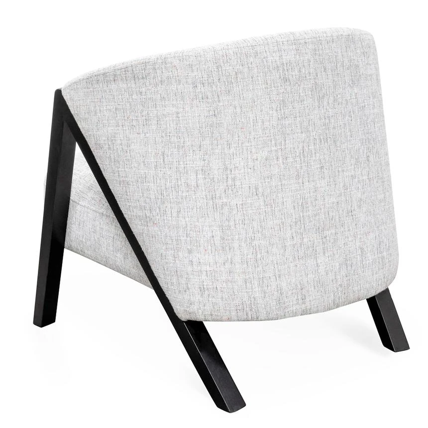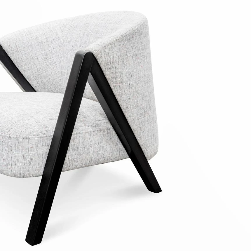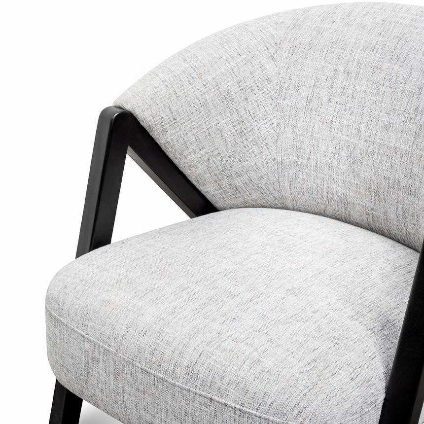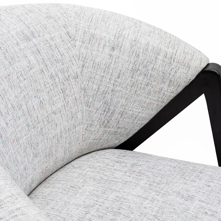 Upholstered in light speckled grey fabric for lasting durability Strong angled A-shaped wooden legs in a black finish offer stable support Curved back offsets the sharp straight lines of the silhouette for a balanced design Densely cushioned seat and backrest for a comfortable seating experience Feet protectors included to prevent slipping and floor damage