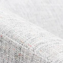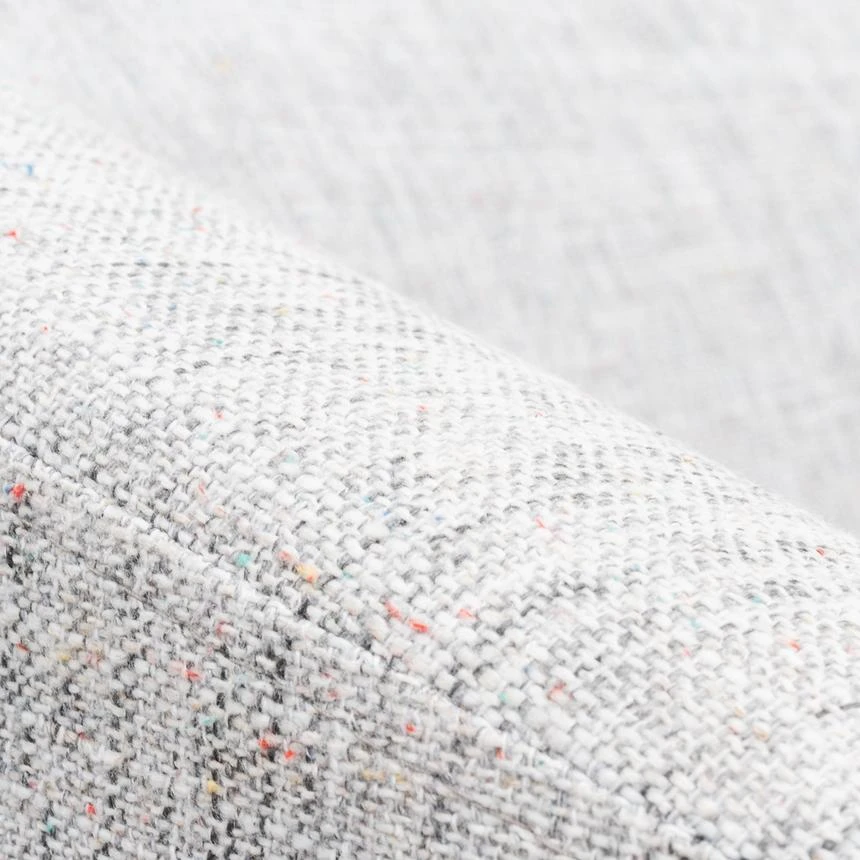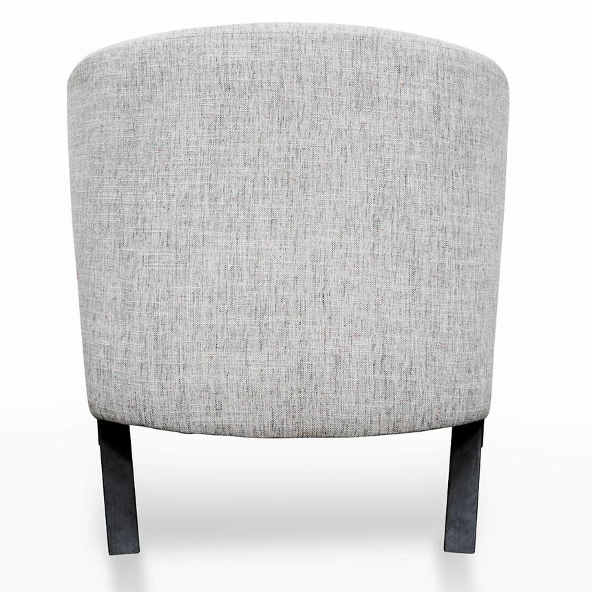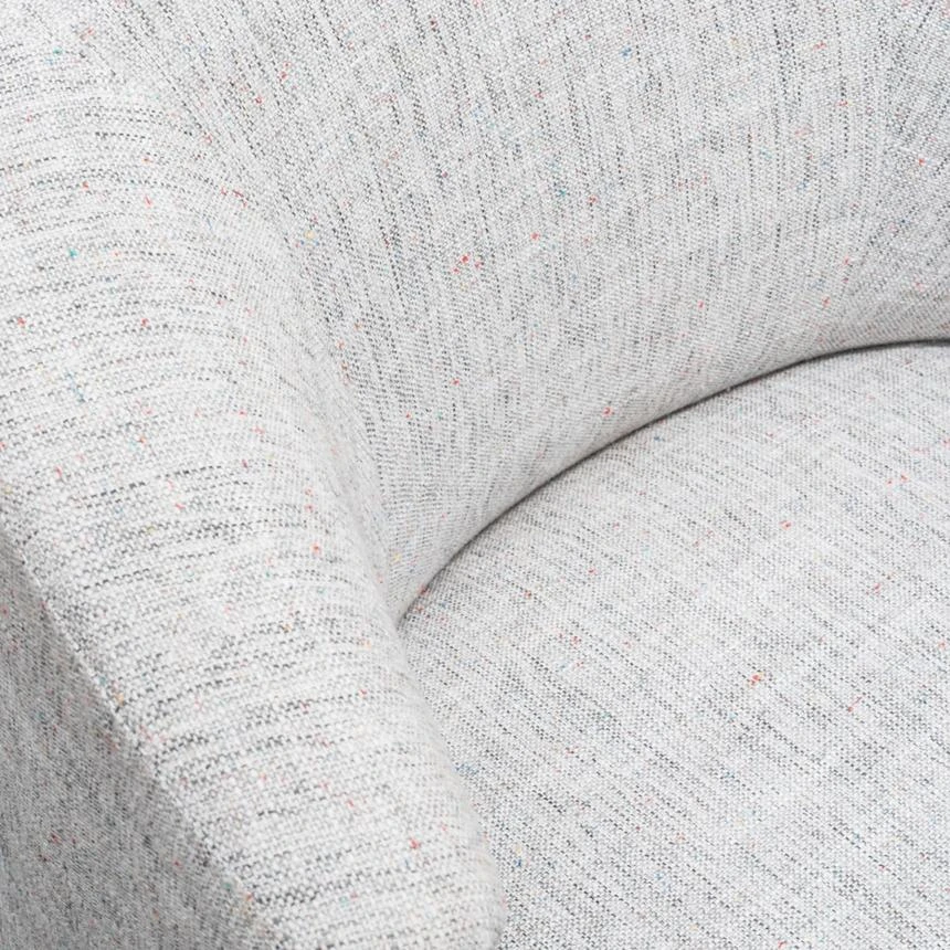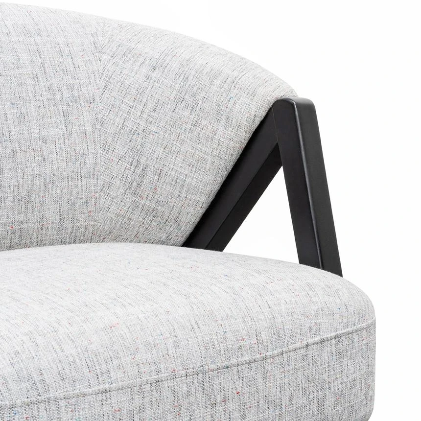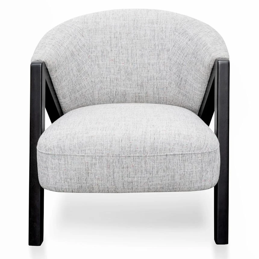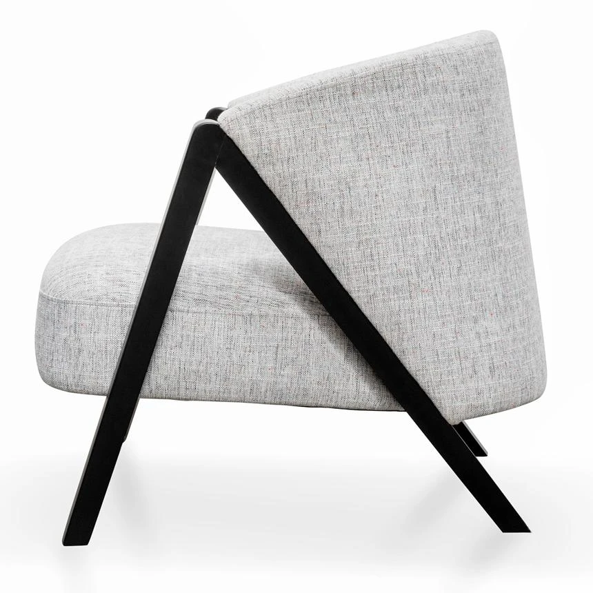 Upholstered in light speckled grey fabric for lasting durability Strong angled A-shaped wooden legs in a black finish offer stable support Curved back offsets the sharp straight lines of the silhouette for a balanced design Densely cushioned seat and backrest for a comfortable seating experience Feet protectors included to prevent slipping and floor damage