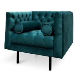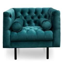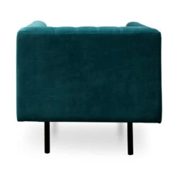 Upholstered in quality and striking Teal Green fabric Refined button tufted details on cushioned seat and backrest Clean, square lines add a contemporary revision to a classic design Strong and stable metal legs in a black coated finish One matching bolster cushion included