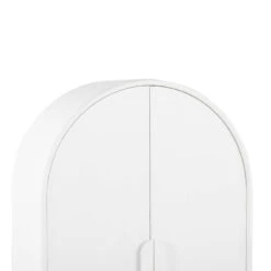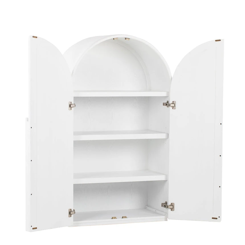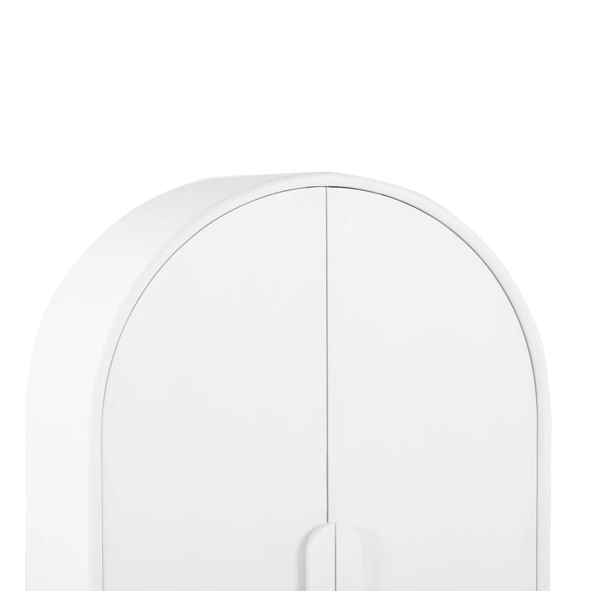 Solid ash wood construction Oiled-based white finish Plywood veneer shelves Elegant arch design Multiple interior shelves Removable and adjustable middle shelf Ideal for minimalist interiors Weight capacity of each shelf: 50 kg Product comes fully assembled