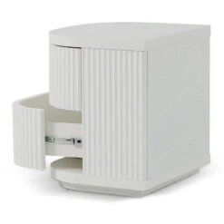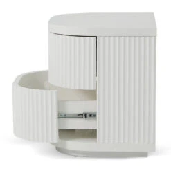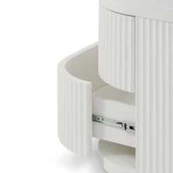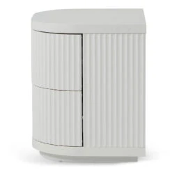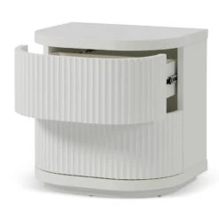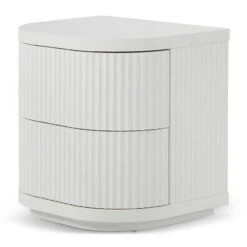 Body is made of engineered wood Finished in matt white paint 2× drawers with slides for pull-opening Drawers and sides designed with vertical grooves Metal base with matt white powder coating Top panel is finished in wood textured veneer Distributed weight capacity of 30kg Product is fully assembled
