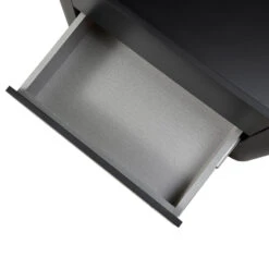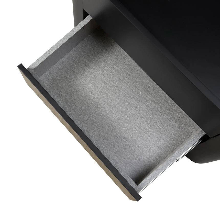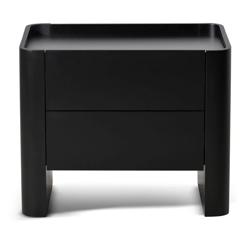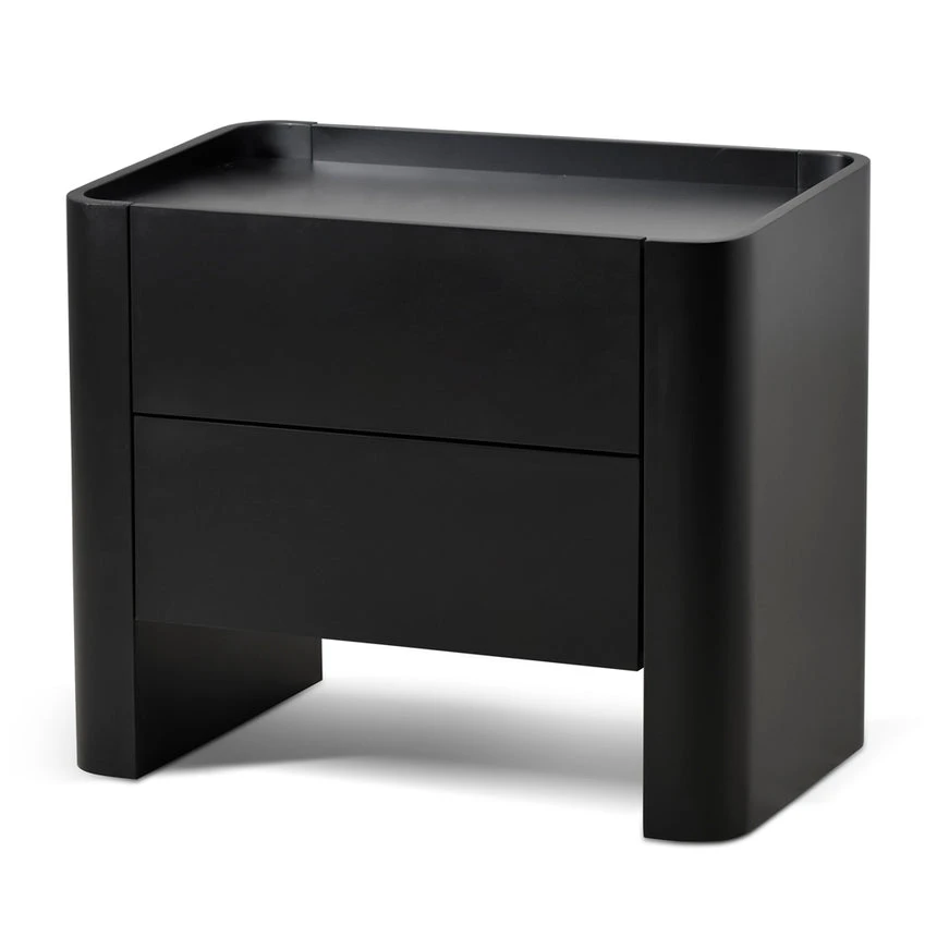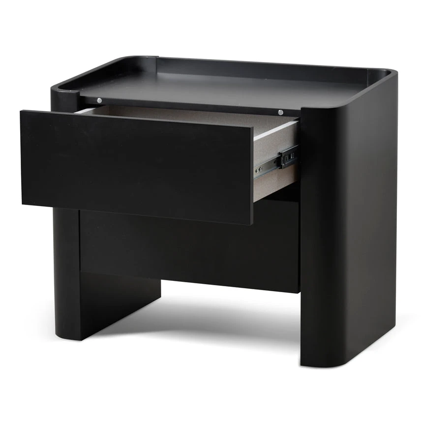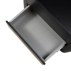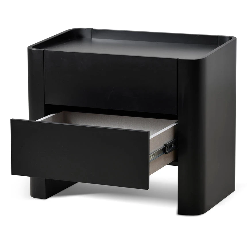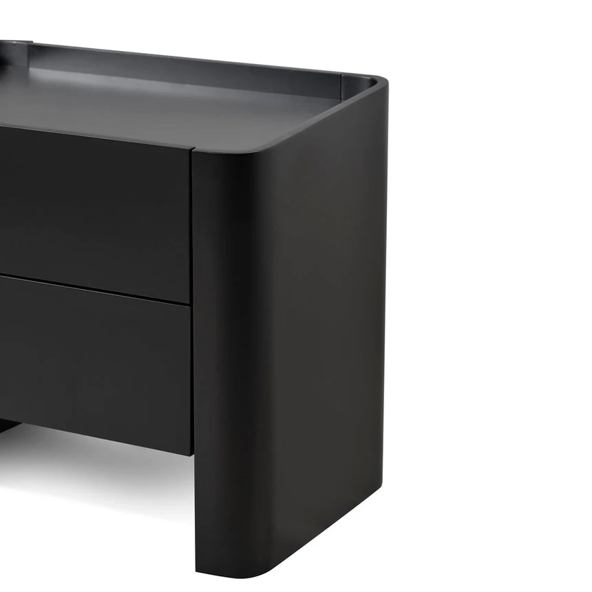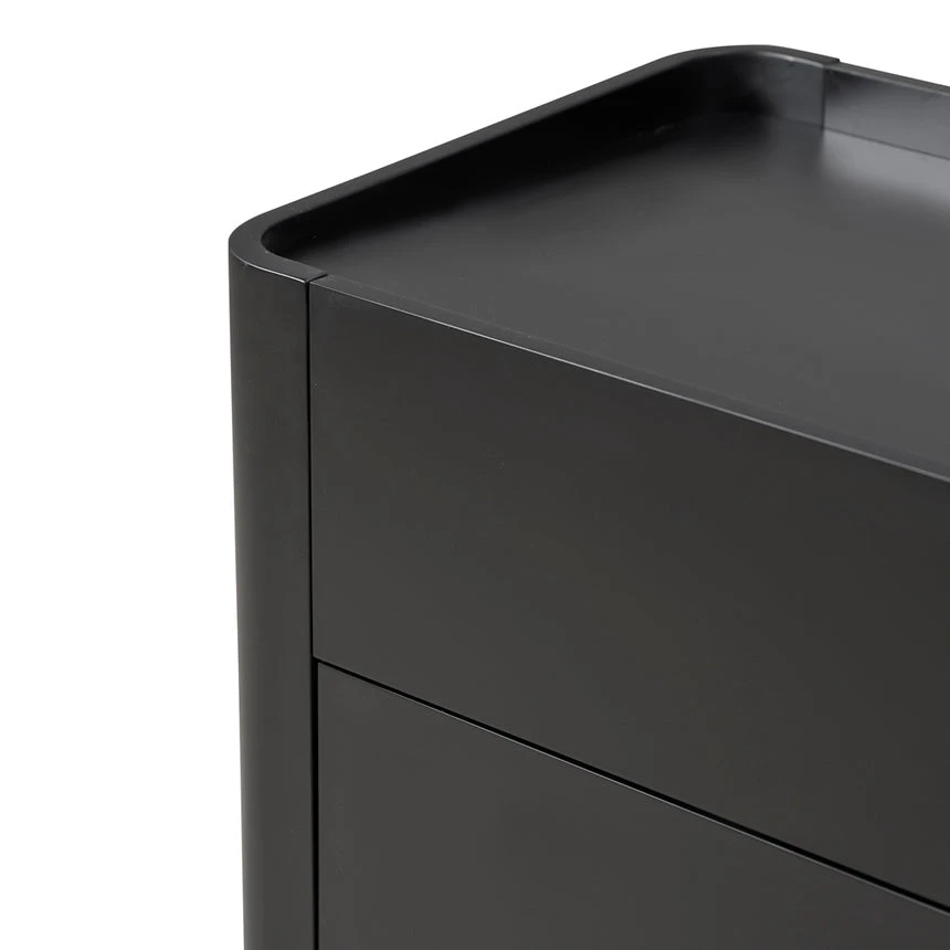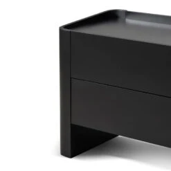 Engineered wood construction Black melamine board components Matte black finish 2 pull-out drawers on smooth metal rails Soft rounded edges on corners Minimalist design Weight Capacity: 50 kg Product comes fully assembled