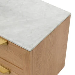 Natural oak veneer, marble top, & brushed brass handle E1 standard panel with real marble top Brushed impudence handle Natural wood textures & dusty oak finish 2x pull-out drawers with smooth metal railings Premium natural color 20kg weight limit on top, 5kg weight limit for drawer Minor Assembly Required