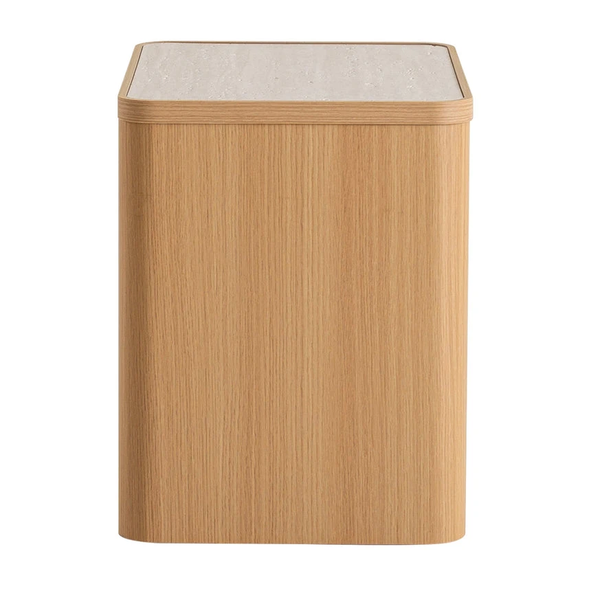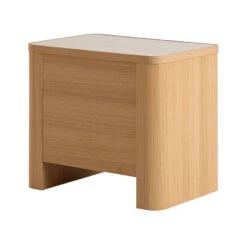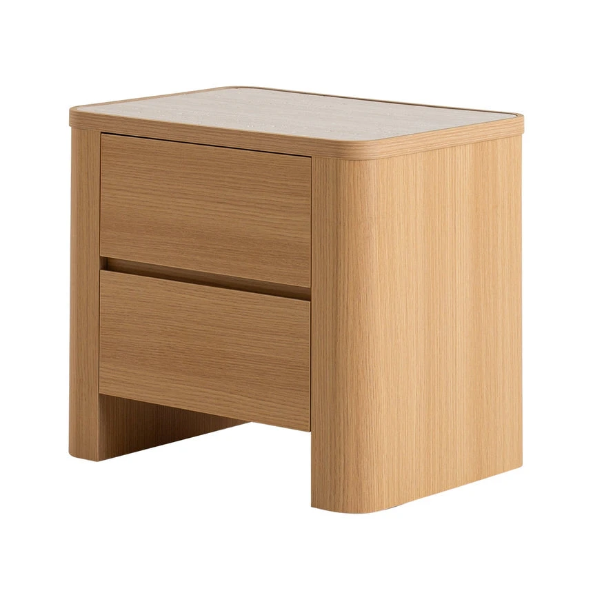 Engineered wood with flexible stone top Melamine-coated particleboard body Pull opening and soft-close mechanism Minimalist design Smooth rounded edges Two drawers Handleless Natural finish Weight Capacity: 50 kg Product comes fully assembled