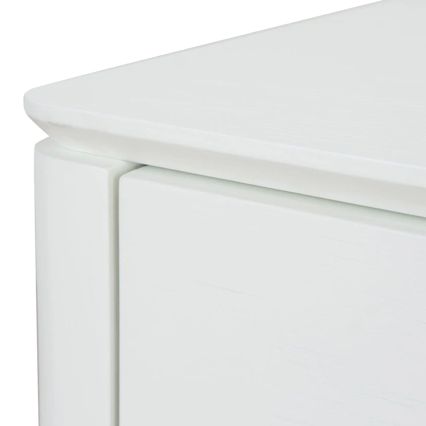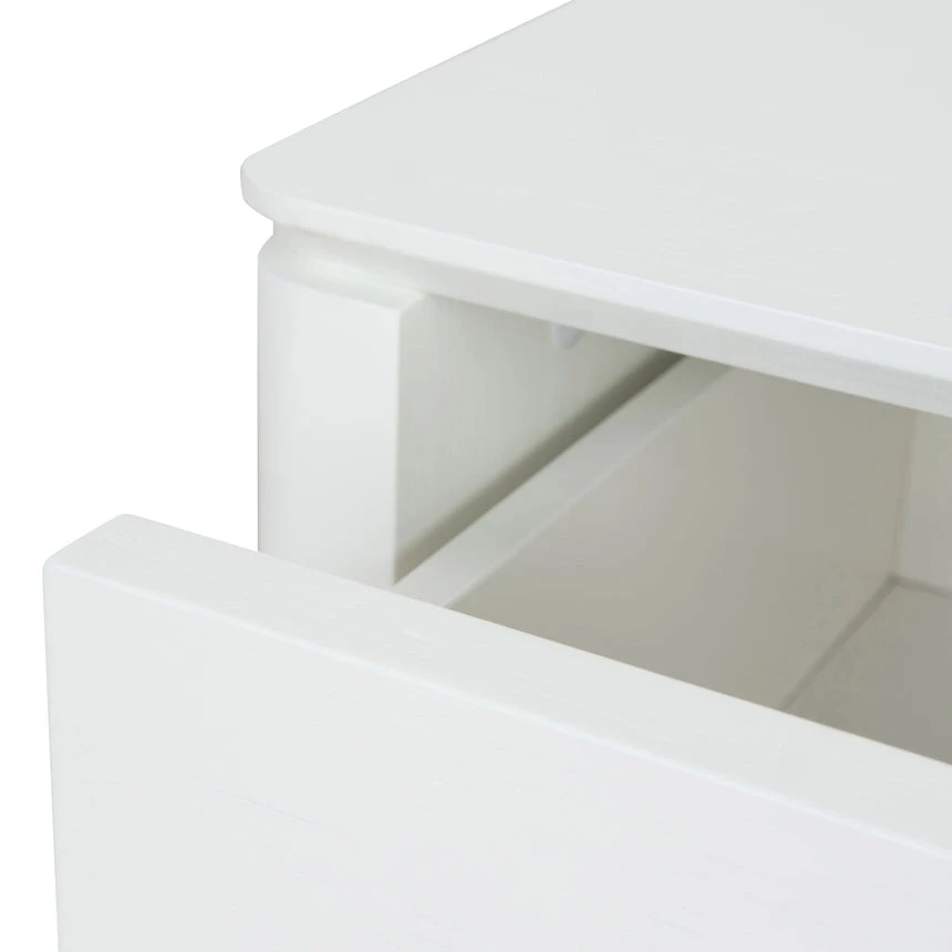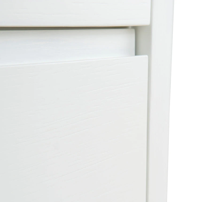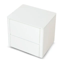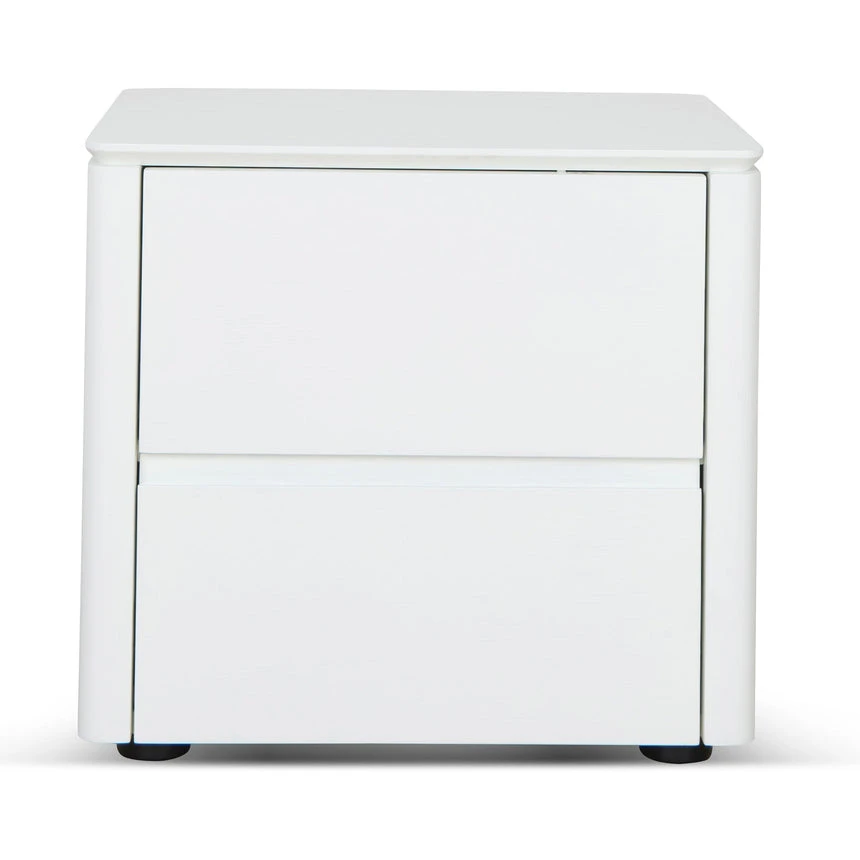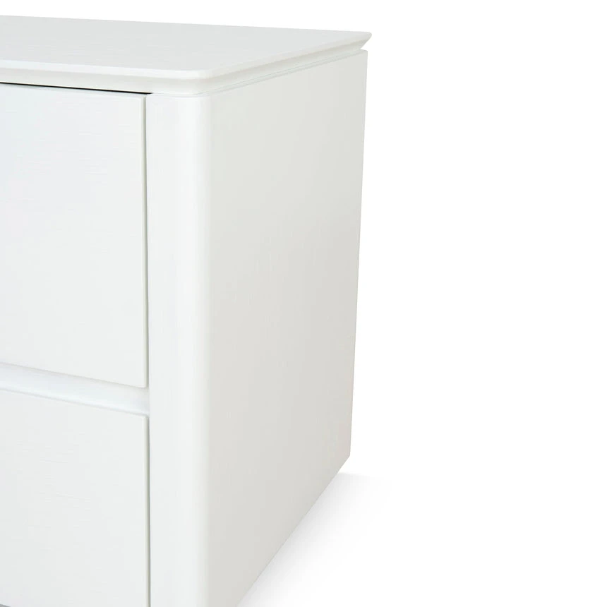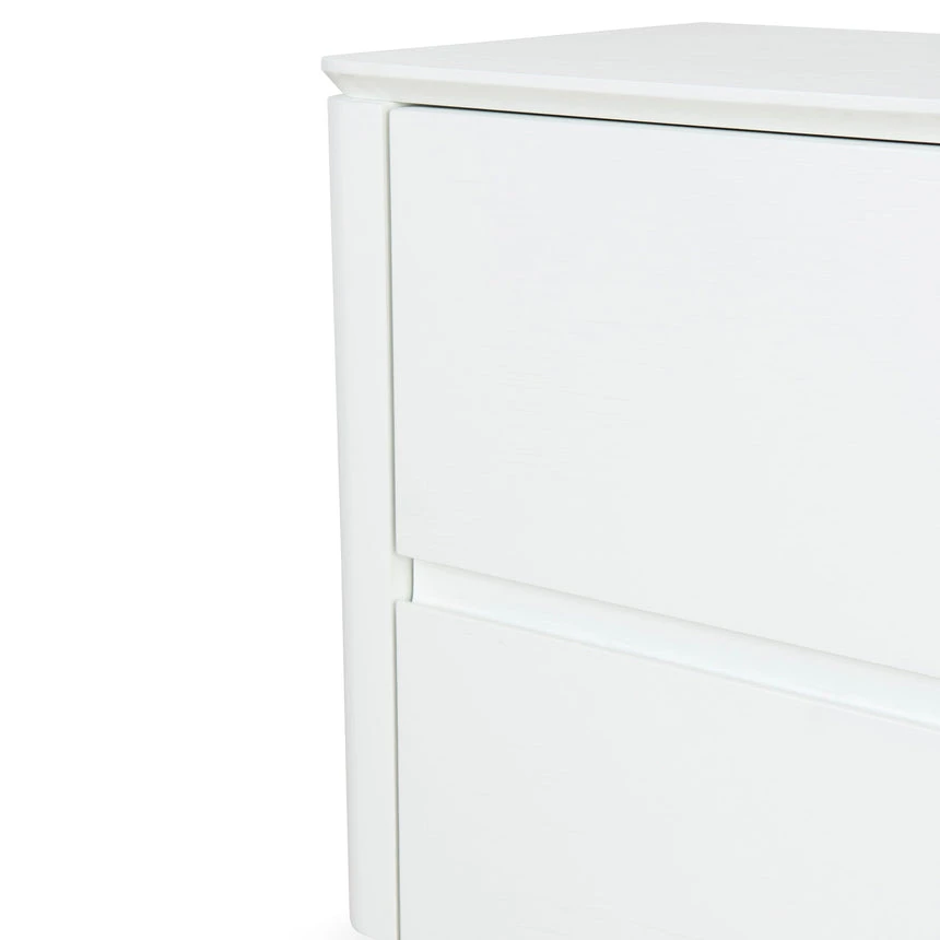 Engineered wood with veneer White oak veneer finish Pull-to-open drawers Minimalistic design Enhances bedroom aesthetics Rounded corners Weight Capacity: 40 kg Minor assembly required
