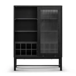 MDF in Black oak Veneer finish Flute glass sliding doors 2 level wine storage on both sides 3x spacious shelves Black oak legs 200kg weight limit Not suggested for commercial use Product comes flat pack and requires two person assembly p> Notes : As this product is flat-packed, please note that once the item has been partially or fully assembled, it will not be eligible for a change of mind return. Change of mind returns will only be accepted if the assembly has not been attempted and the item is in the original packaging.