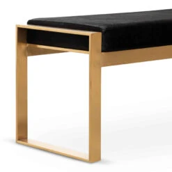 Black velvet fabric upholstery with rich textures throughout Frame and detailing in stainless steel construction Plush cushion with foam and fibre insert Metal look legs in a brushed gold finish Sophisticated profile featuring a linear silhouette Narrow and rectangular design to suit all spaces The product is fully assembled Optimize your space with long ottomans , offering ample seating and a sleek design. These versatile pieces make an excellent addition to your decor.