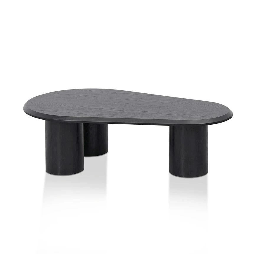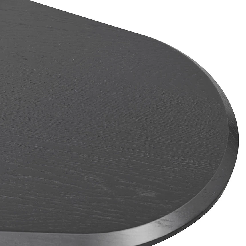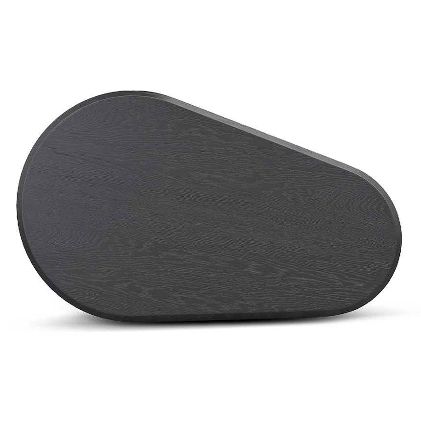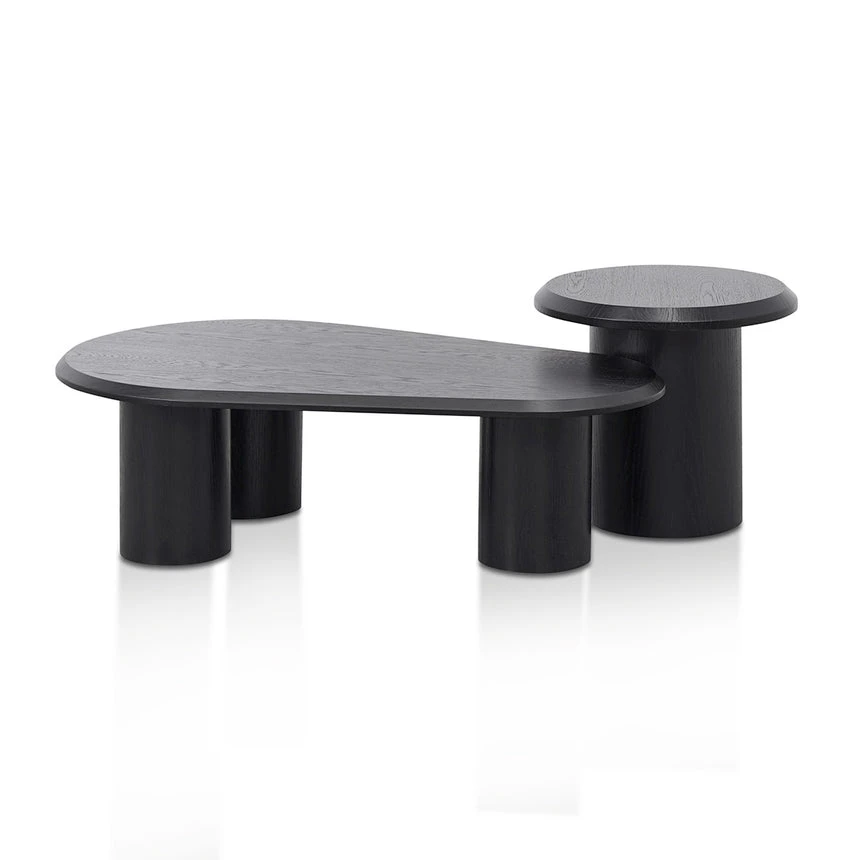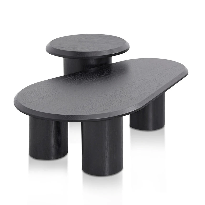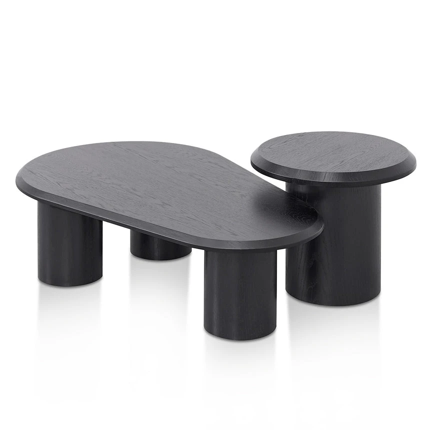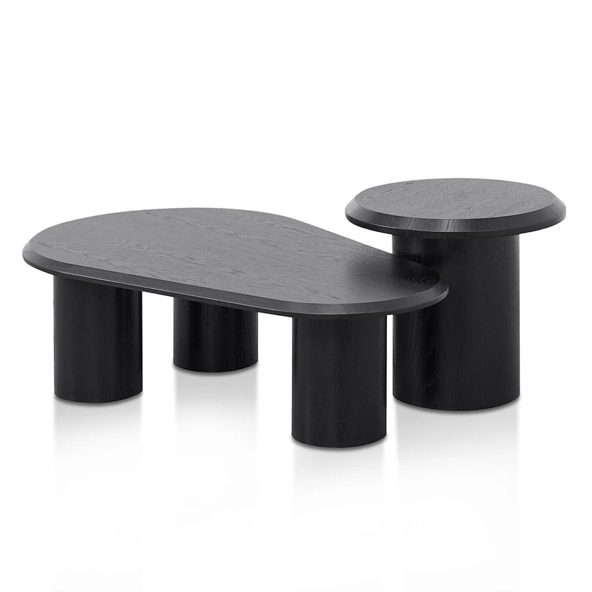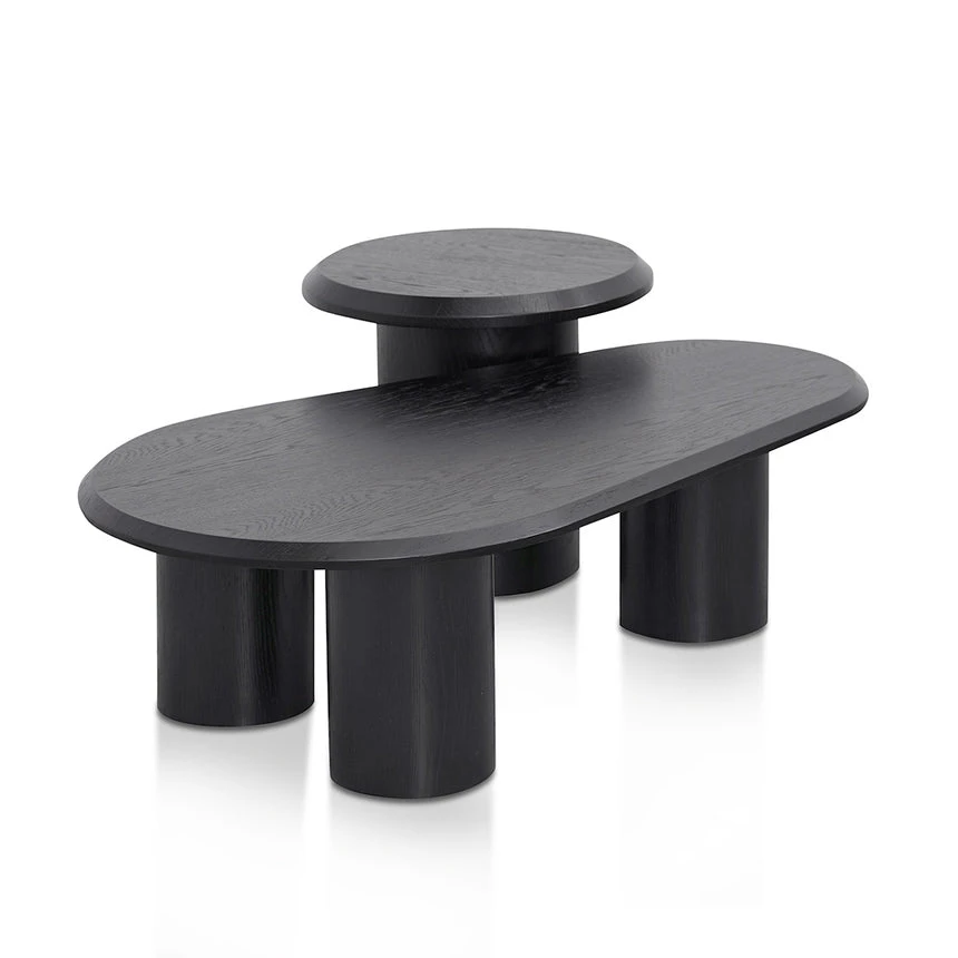 Engineered wood construction Black oak veneer finish with wood grains Includes 1 nested coffee table and 1 round side table Table tops have a 45° chamfer Thick spherical legs with black oak finish Coffee table weight capacity: 50 kg Side table weight capacity: 30 kg Product is flat pack and requires two-person assembly