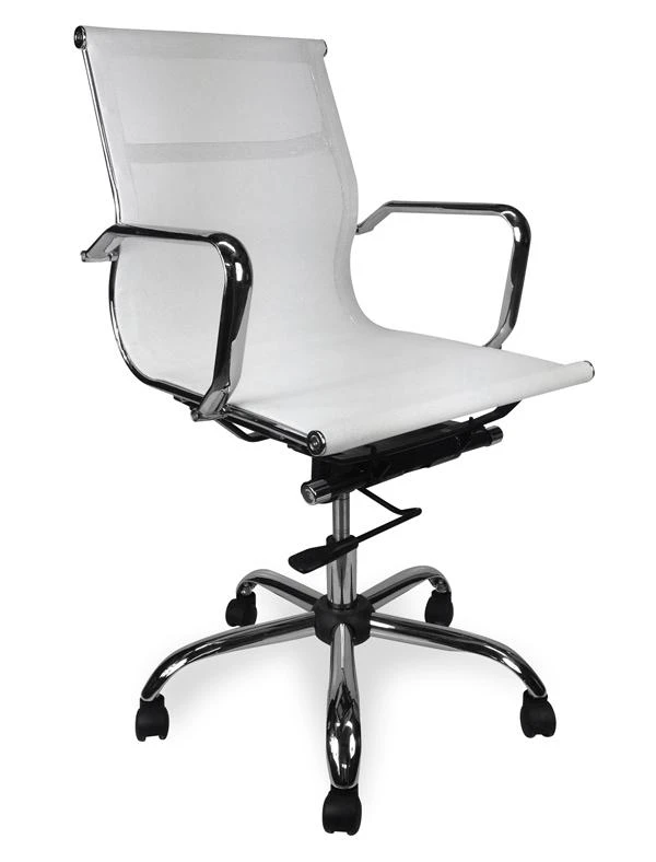 Low back Commercial grade elastomeric mesh Polished chrome One touch gas lift height adjustment Removable armrests Tilting suspension system with locking mechanism 1 year manufacturer’s warranty against defects Minor assembly required Note: This product is a thoughtful replica of Charles and Ray Eames’ iconic design and is not manufactured or affiliated with the original designer or distributor.