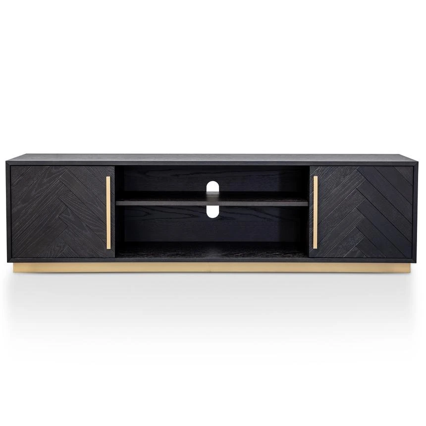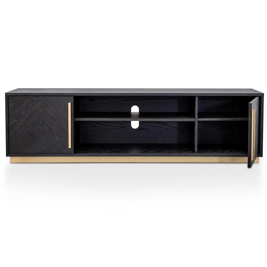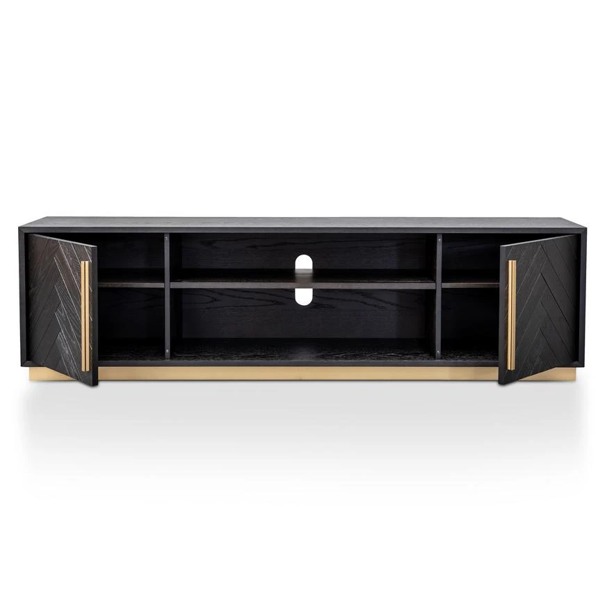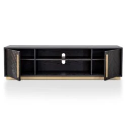 Black wood veneer finish Unpolished brass base and handles One shelf behind each door Fully assembled