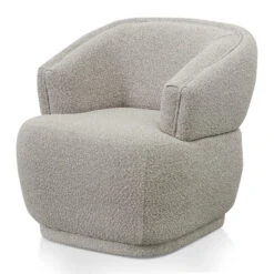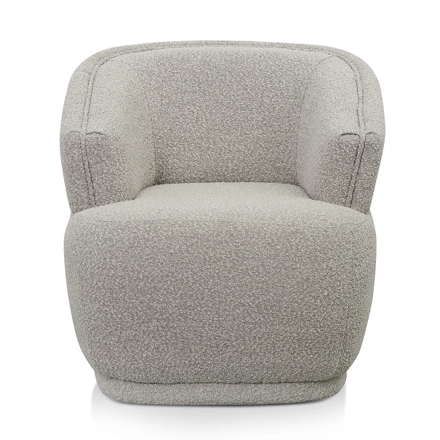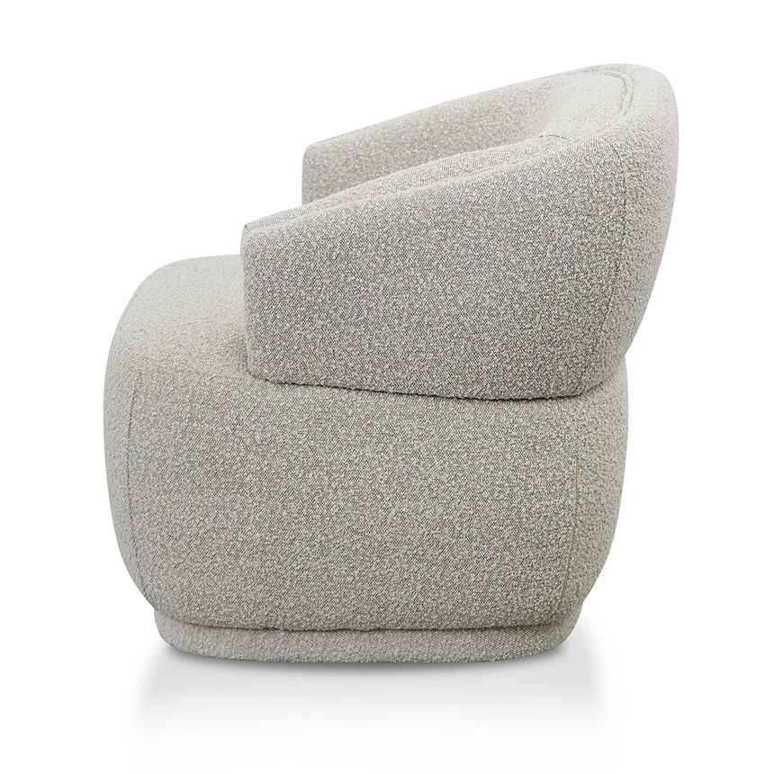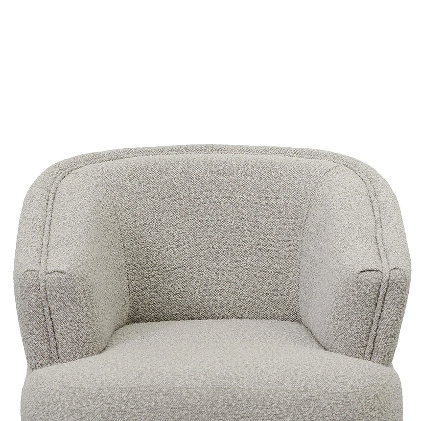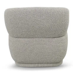 Ash grey boucle fabric Upholstery consists of 95% polyester and 5% acrylic Pinewood timber construction Foam with web suspension Soft-medium seating firmness Tub chair silhouette on a solid base Weight Capacity: 140 kg Product comes fully assembled