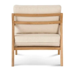60% Linen and 40% Cotton blend Timber oak frame and square legs Removable cushions Light beige fabric Filled with 100% foam Soft medium seat firmness Weight capacity of 150kg Suitable for commercial use Product comes fully assembled