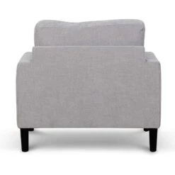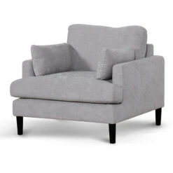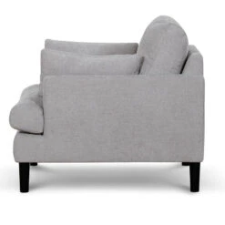 Upholstered in a 100% polyester oyster beige fabric Frame in a timber wood construction Tapered legs in a matte black timber boxwood build Seat and backrest with a feather and fibre insert Web and spring suspension included Soft-medium seating firmness 2x matching scatter cushions included Minor assembly required to attach legs to base