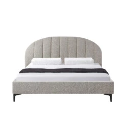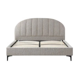 Upholstered in a 100% polyester sand boucle finish Frame made of engineered wood High-density foam inserts 4x matte black legs with floor protectors Channel-tufted semicircular plush headboard Sturdy bed frame slats equipped with strong center support rails 300kg weight capacity Suitable for commercial use Product comes flat pack and requires two-person assembly with electric drill