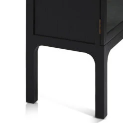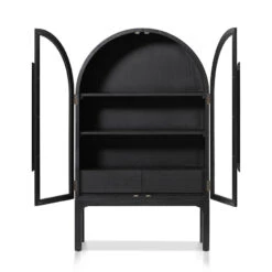 Solid Ash wood frame 3x plywood veneer shelves 2x Tempered glass doors 2 long metal handles Full black body with semi circle design Weight Capacity: Top (100kg), Drawer (40kg), Shelf (60kg) Product is fully assembled Melbourne pick-up and delivery only