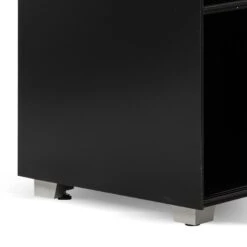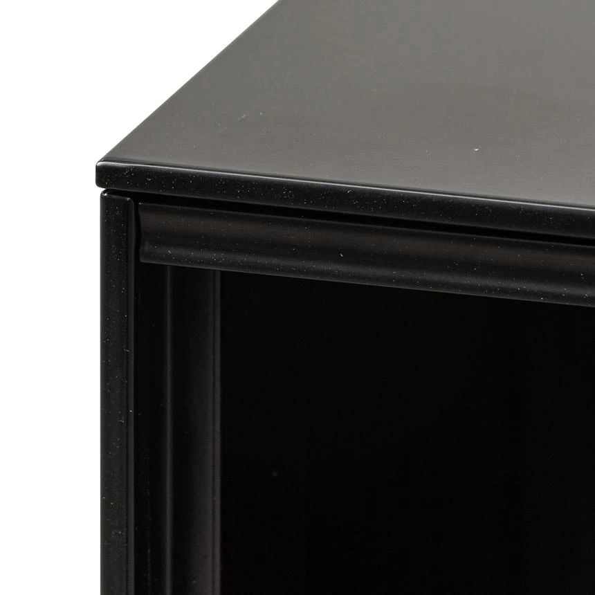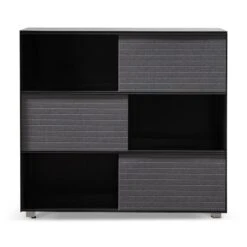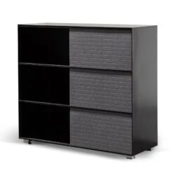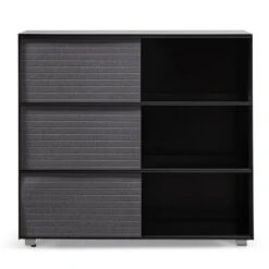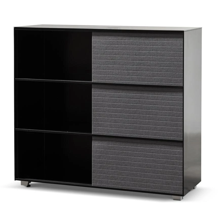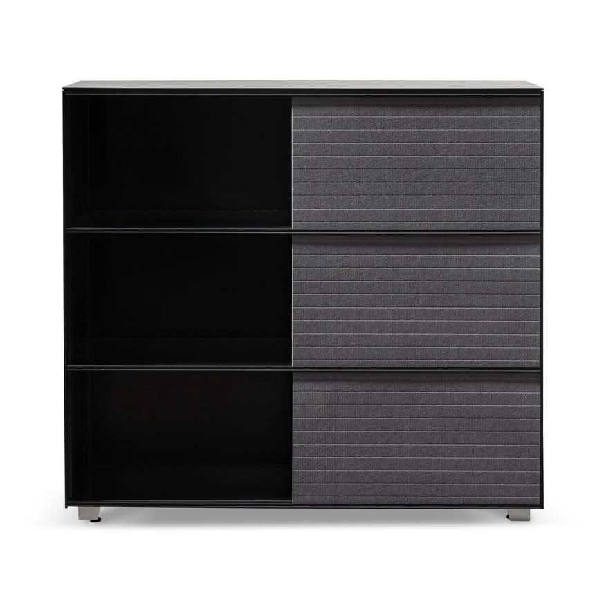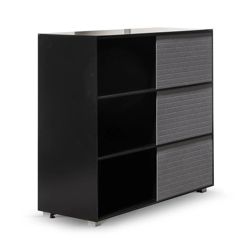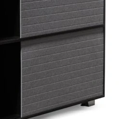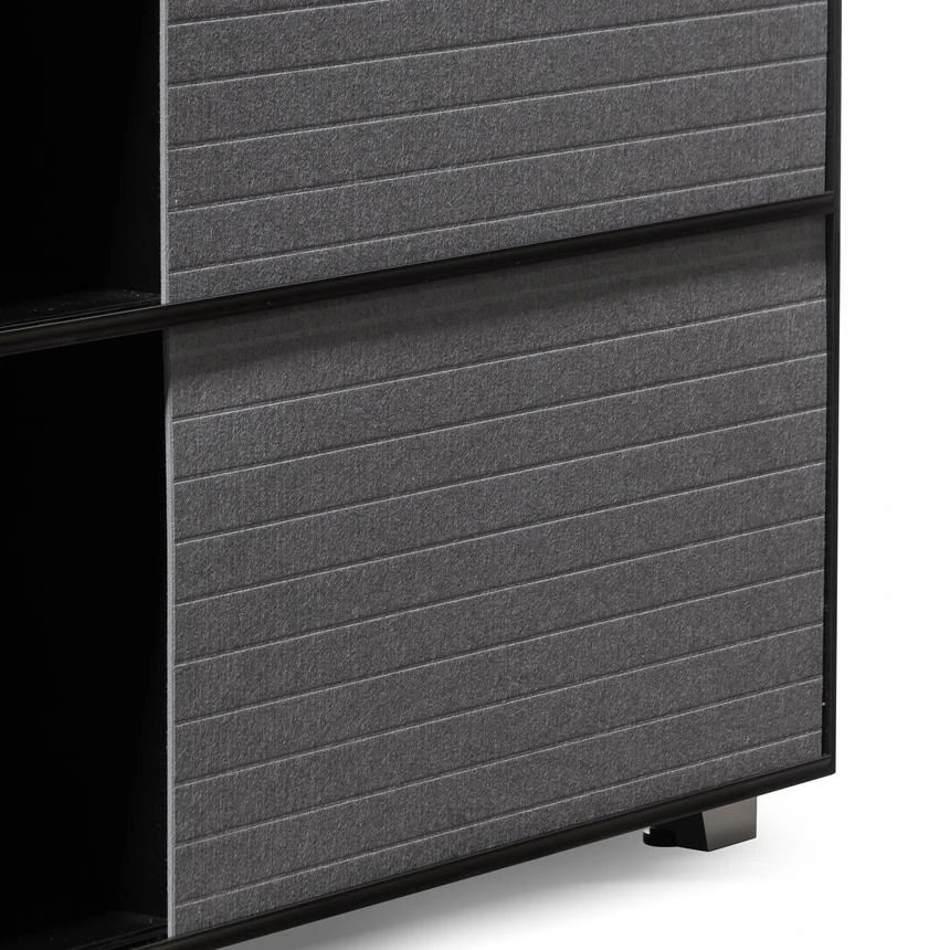 Frame and detailing in a durable metal construction Complete powder black finish for a complementary look Adjustable panels in a grey soft-to-touch felt build Felt panels include horizontal stitch detailing for added interest Minimalist profile consisting of clean and linear body Compact yet generous in size, offering ample space to store and display Product is fully assembled.