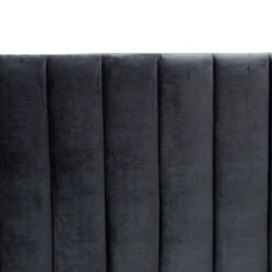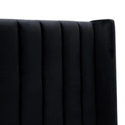 Frame and bed head upholstered in black velvet Vertical linear seam pattern on bed head Strong hardwood frame and included slats Bed frame supported by recessed black steel legs Fits a standard king size mattress Note: Product is flat packed and requires two-man assembly. Due to the nature of velvet, apparent colour creases and bruises are inherent characteristics which should not be considered as defects. Avoid contact with liquids to maintain the product and to prevent marking the velvet fabric