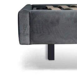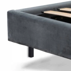 Frame and bed head upholstered in 100% charcoal polyester velvet Vertical channel patterning on bed head Strong hardwood frame and included slats Bed frame supported by recessed black steel legs Fits a standard king size mattress Product is flat packed and requires two-person assembly Notes: Queen sized pictured here Due to the nature of velvet, apparent colour creases and bruises are inherent characteristics which should not be considered as defects. Avoid contact with liquids to maintain the product and to prevent marking the velvet fabric