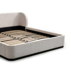 Clay Grey polyester fabric upholstery Tear-resistant fabric Minimal seam slippage (1.7mm) Durable timber, solid wood, and P2 plywood frame construction Birch timber legs Plush foam filling Metal slats frame and legs Closed-side style headboard Weight Capacity: 250 kg Minor assembly required