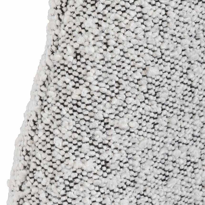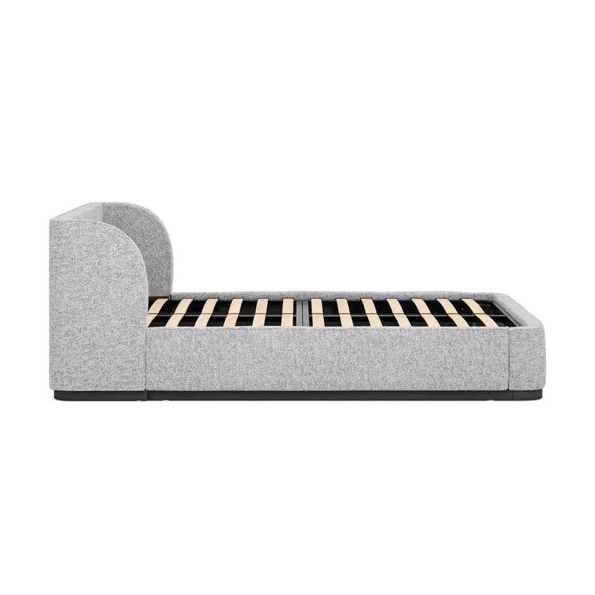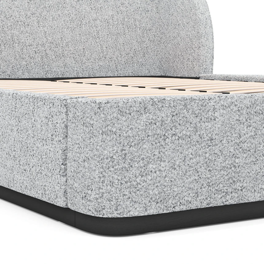 Durable pepper boucle fabric upholstery Fabric in a 80% polyester and 20% acrylic blend Strong hardwood frame and included slats frame Solid wood base in black stain Headboard in curved and wingback silhouette Accommodates a standard king size mattress Product is flat packed and requires two-man assembly Bed slat comes pre-assembled Note: Queen size pictured This product is not on display in our showrooms.
