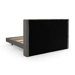 Entire frame and bed head upholstered in 96% polyester and 4% acrylic blend Vertical linear seam pattern on bed head adds subtle style Strong hardwood frame and included slats for mattress support Stable wood legs in a black stain for lasting structural support Accommodates a standard king size mattress Note: Product is flat packed and requires two-person assembly.