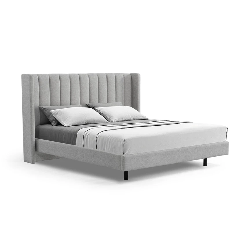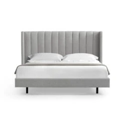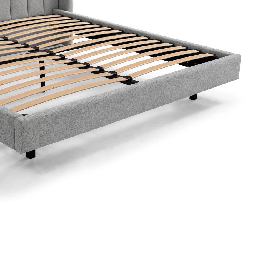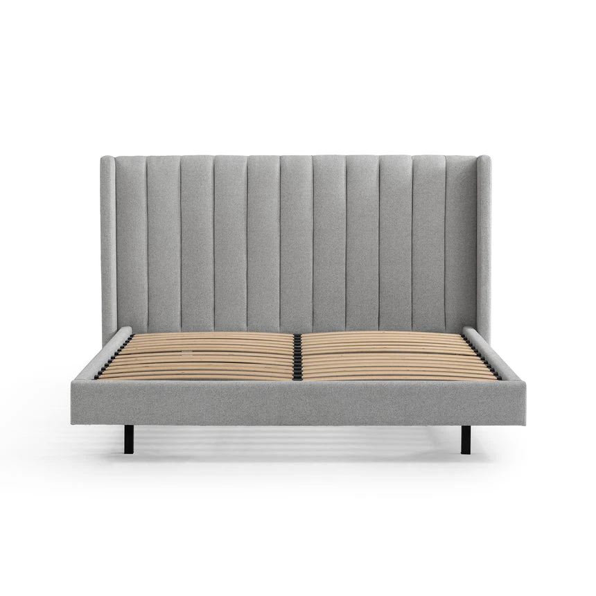 Frame and bed head upholstered in 96% polyester and 4% acrylic blend Vertical linear seam pattern on bed head Strong hardwood frame and included slats Bed frame supported by metal legs Fits a standard king size mattress Note: Product is flat packed and requires two-person assembly.