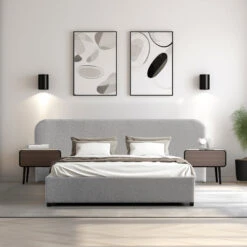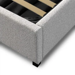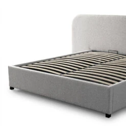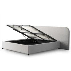 Clay grey polyester upholstery Timber, solid wood, and P2 plywood frame Hydraulic gas lift Rubber legs Foam filling Gas lift supports up to 50 kg Ample storage space under the bed Stylish design enhances bedroom aesthetics Weight capacity: 300 kg Two-person assembly required Notes: Bed mattress not included