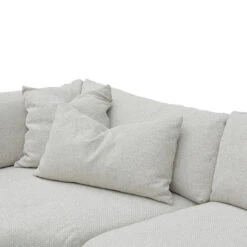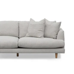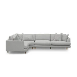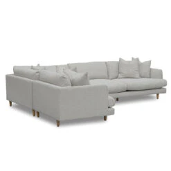 Upholstered in a sterling Sand fabric Fabric consists of a 91% polyester and 9% acrylic blend Plush cushions with a premium foam and feather insert Includes spring suspension for lasting structural integrity Tapered legs in an birch wood construction and natural finish L-shaped modular design, featuring a left return Features 5x single-sided scatter cushions Feet protectors included to prevent slipping and product damage Seats 4-5 people Minor assembly to attach legs to base