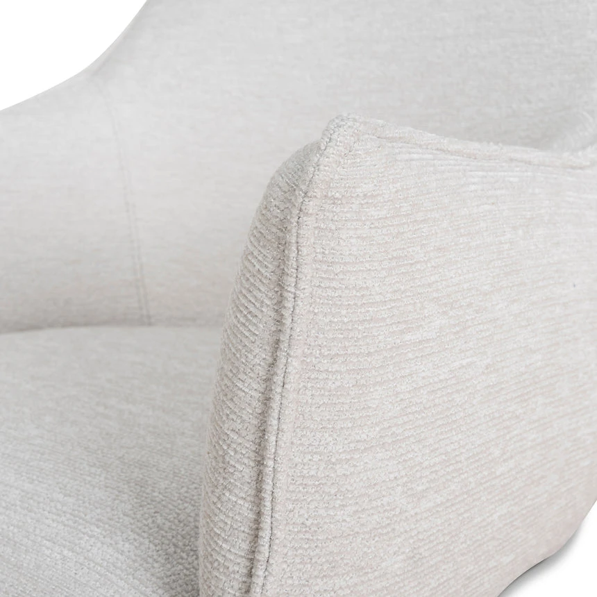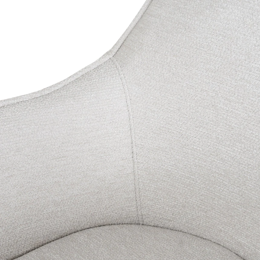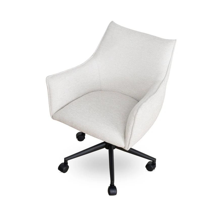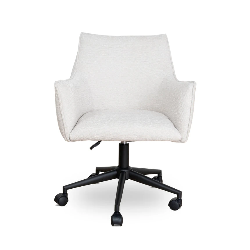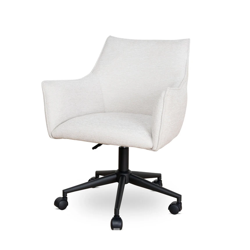 Bright grey polyester upholstery Timber and plywood body Iron frame construction Height adjustable with 360° swivel Smooth-rolling nylon caster wheels Soft-to-medium seat firmness Soft curves and subtle detailing Weight Capacity: 120 kg This product is supplied flat-packed and requires assembly by two people