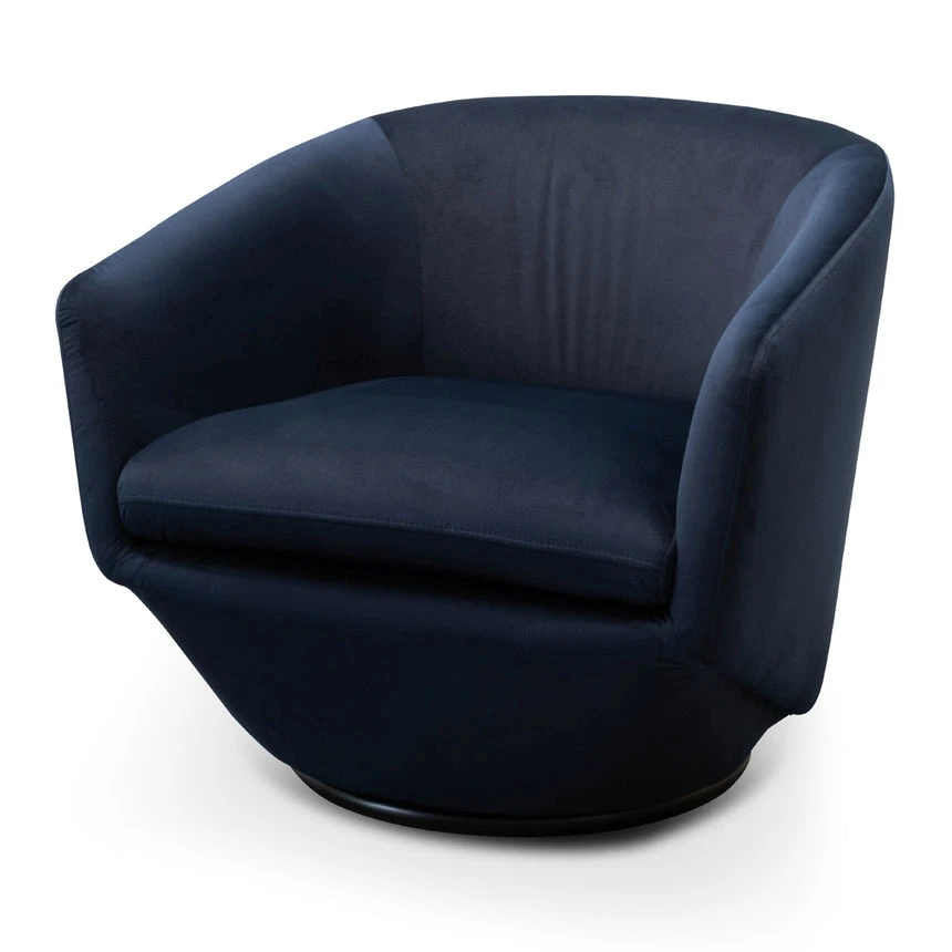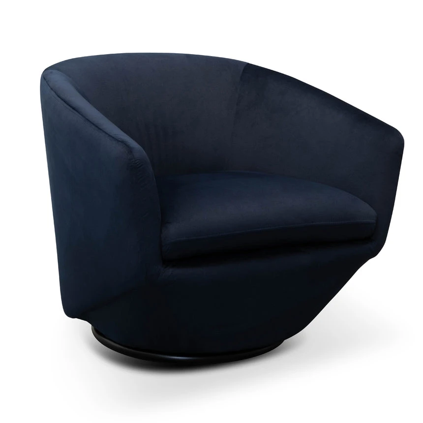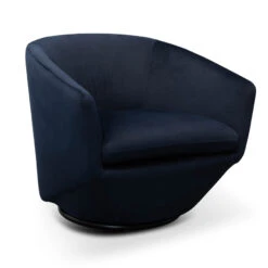 Fully upholstered in dark navy velvet fabric 360 degree swivel base for convenient mobility Tub-like silhouette with armrests for an inviting design Dense seat cushion and padding offers comfort