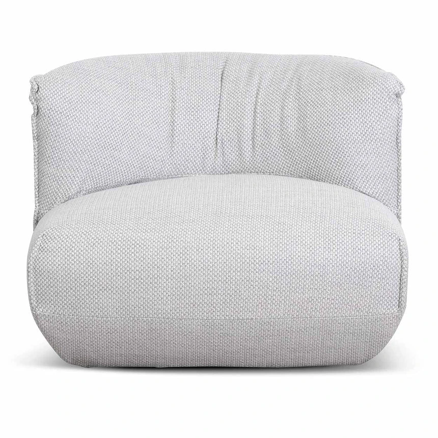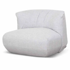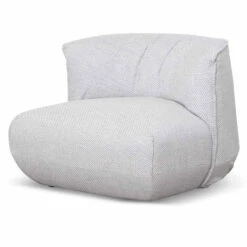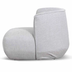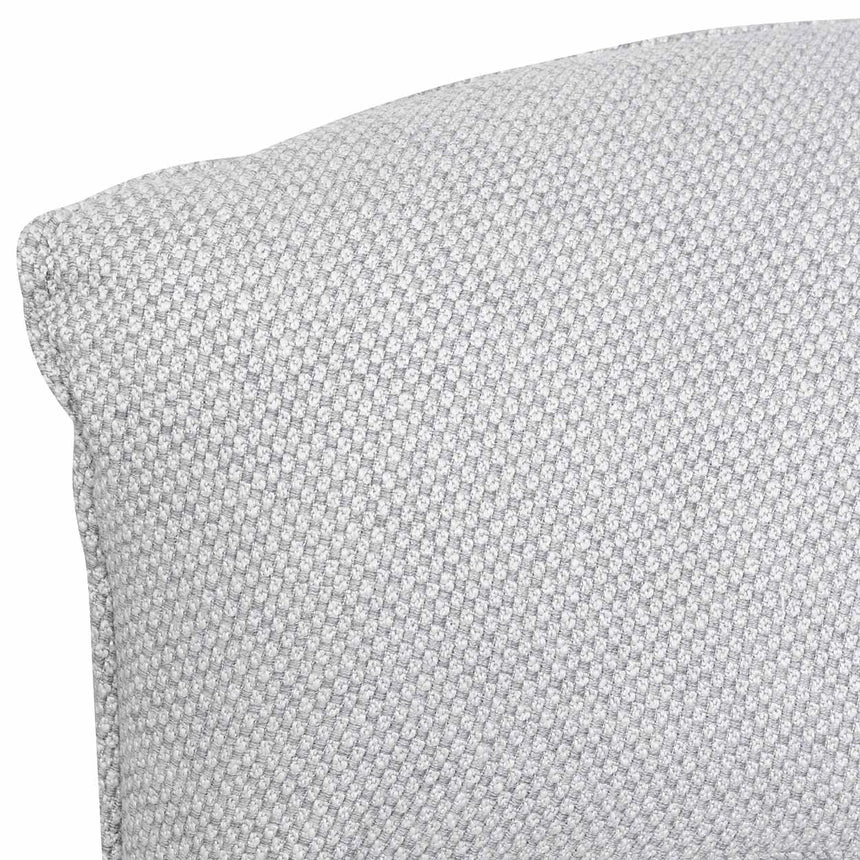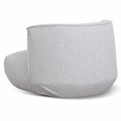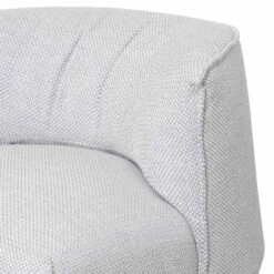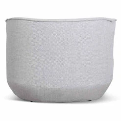 Upholstered in a passive grey fabric Fabric consist of 78% polyester, 12% cotton, 8% viscose and 2% acrylic blend Constructed from timber pine wood and polypropylene base Elastic ribbon suspension and foam and feather insert Soft-medium seating firmness Product comes fully assembled