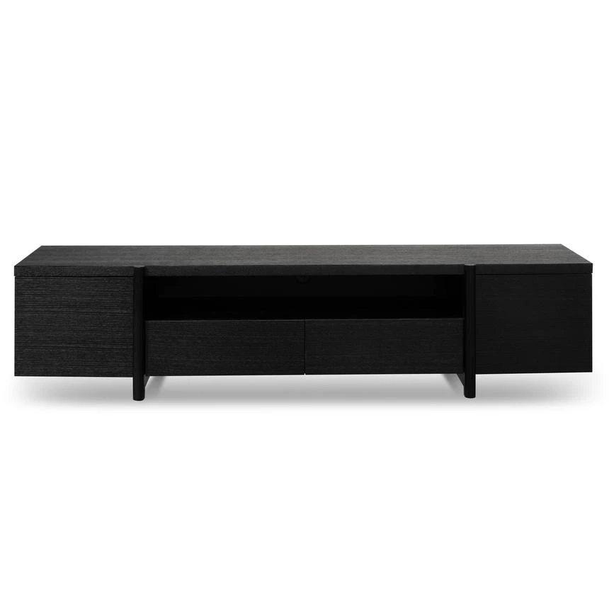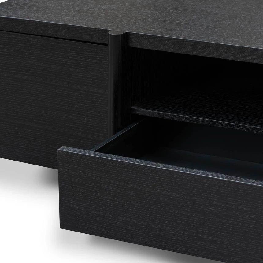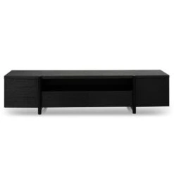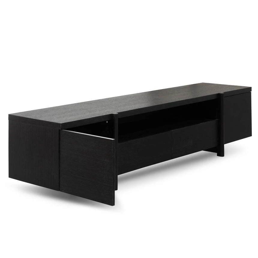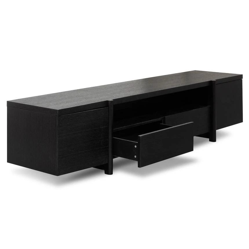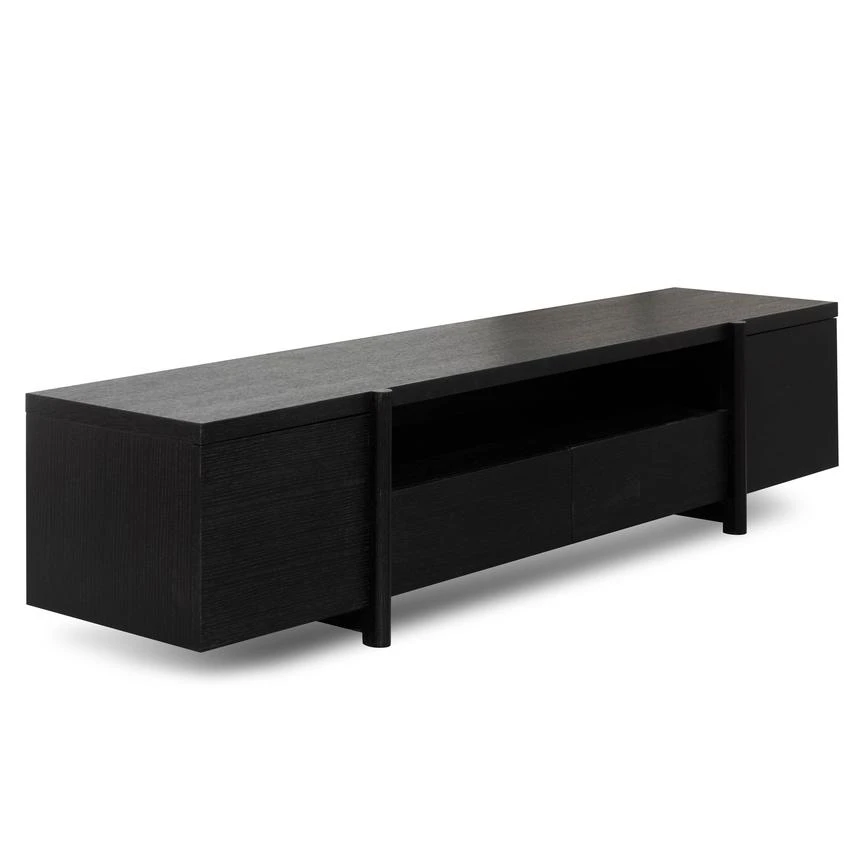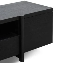 Features 2x side cupboards, 2x middle drawers, and 1x middle top shelf for storage Made from durable and strong natural wood and MDF in a black finish Soft closing drawers for a smoother and quiet movement Two vertical front elements to add dimension to overall design Additional 1x appliance hole for easy cable management Note: Product requires two-person assembly and furniture assembly experience.