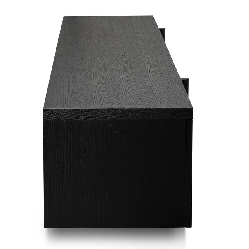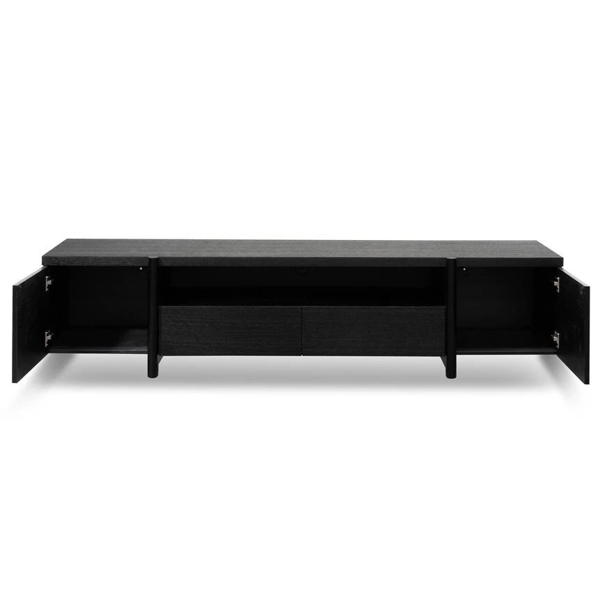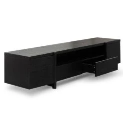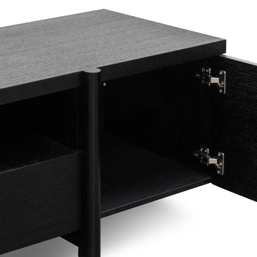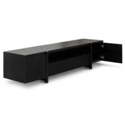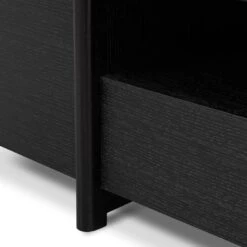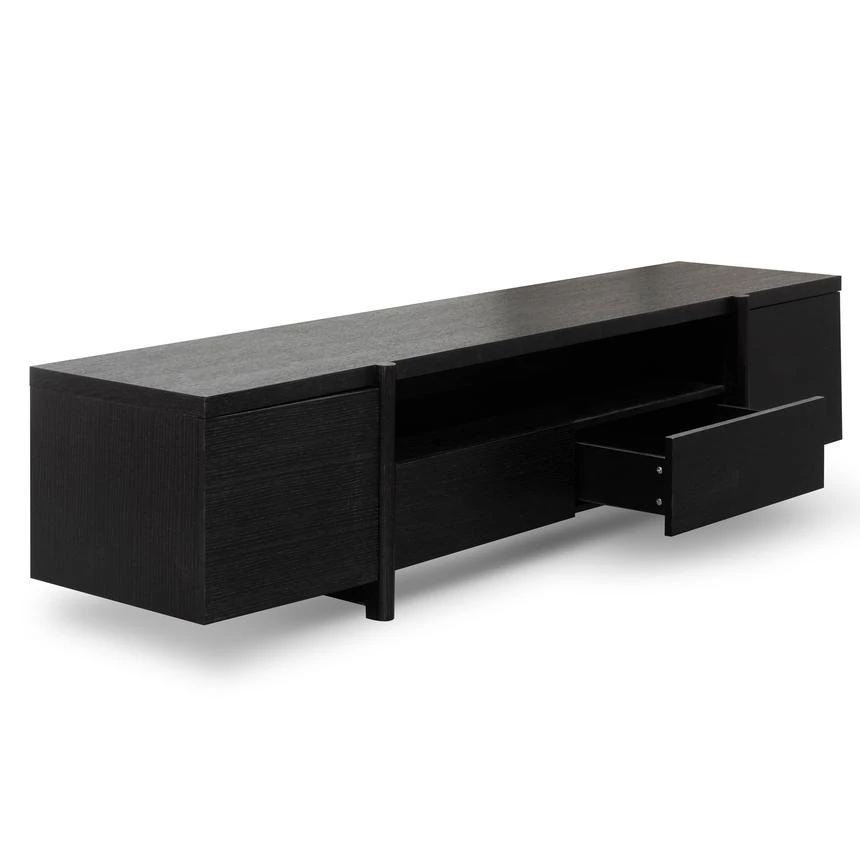 Features 2x side cupboards, 2x middle drawers, and 1x middle top shelf for storage Made from durable and strong natural wood and MDF in a black finish Soft closing drawers for a smoother and quiet movement Two vertical front elements to add dimension to overall design Additional 1x appliance hole for easy cable management Note: Product requires two-person assembly and furniture assembly experience.
