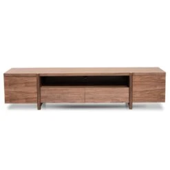 Features 2x side cupboards, 2x middle drawers, and 1x middle top shelf for storage Made from durable and strong natural wood and MDF in a walnut finish Soft closing drawers for a smoother and quiet movement Two vertical front elements to add dimension to overall design Additional 1x appliance hole for easy cable management Note: Product requires two-person assembly and furniture assembly experience.