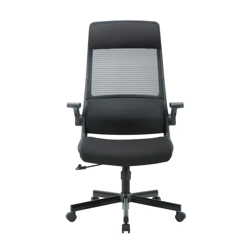 Metal Base along with plastic and nylon . Fabric seat and Mesh Back Height Adjustable Headrest & Lumbar Support Flipped Arms Plywood seat filled with Cutting Foam Locking tilt mechanism UE KD Structure Painted Steel Base 50R PA Black Castors 120kg weight limit Product is flat pack and requires two person assembly