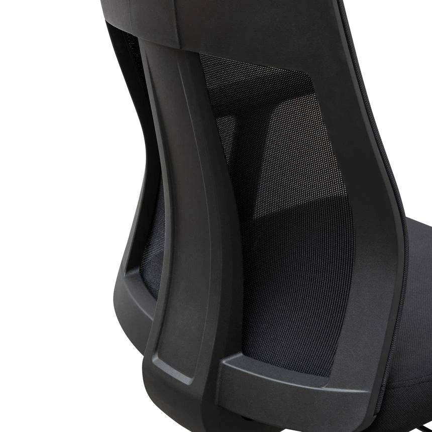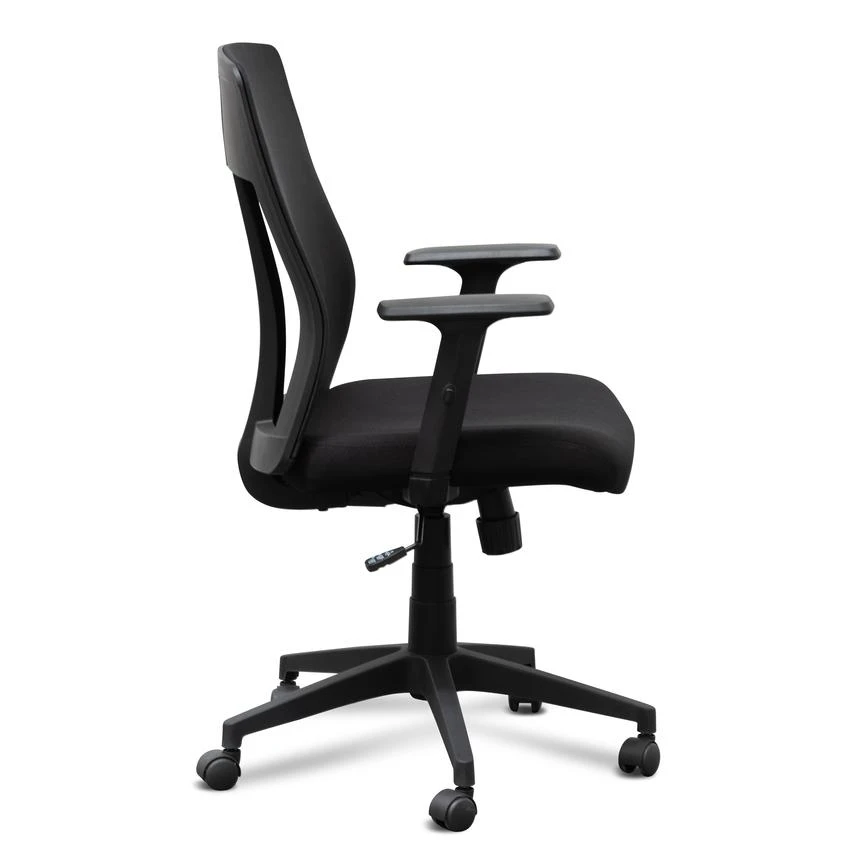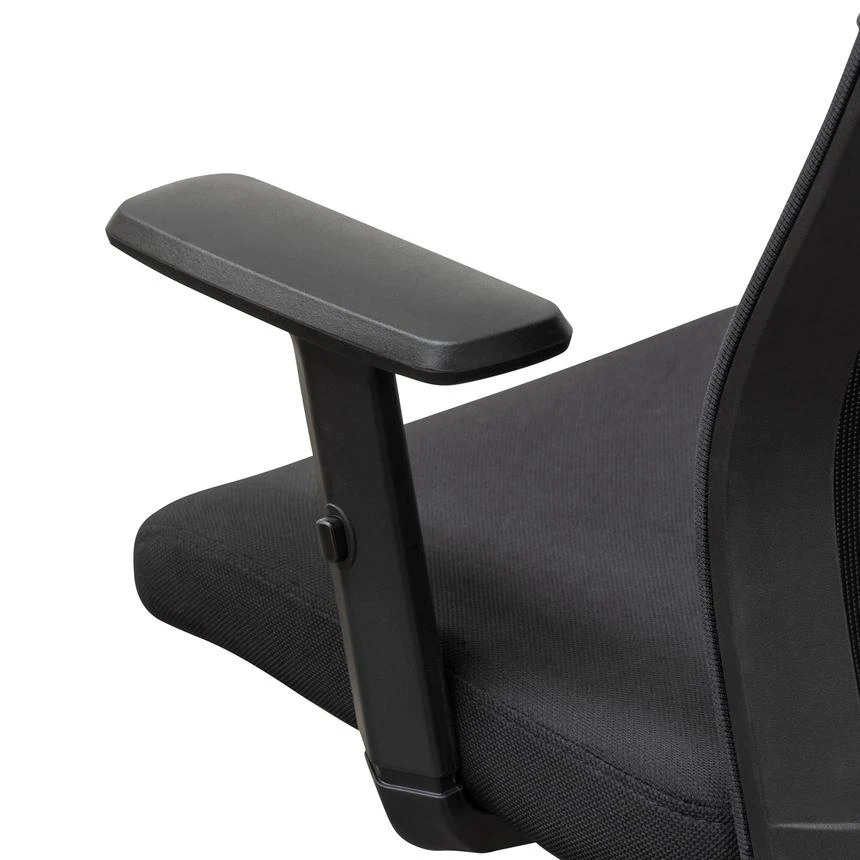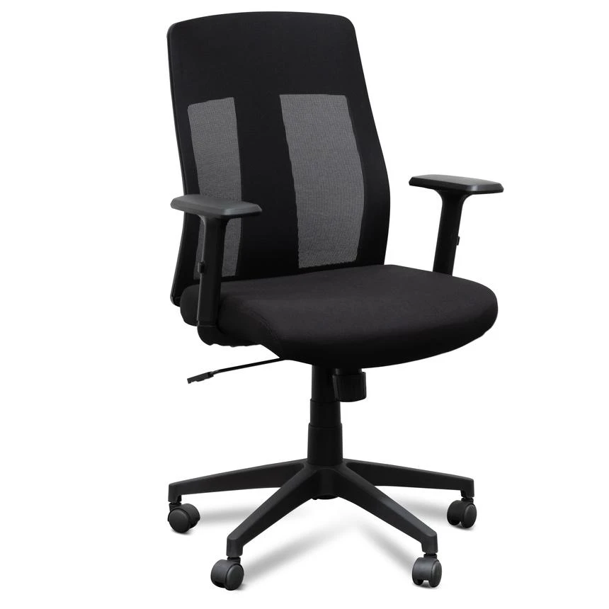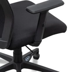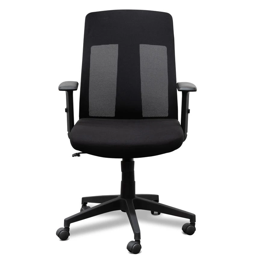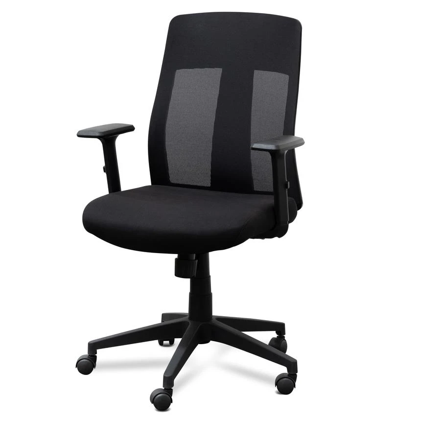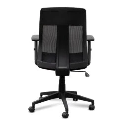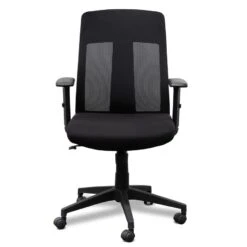 Tall black mesh upholstered backrest for breathable comfort Consistent lumbar support follows back and waist for lasting stability Cushioned seat upholstered in black fabric to endure everyday use 360 degree rotating with adjustable height settings Armrests with adjustable height settings to suit any preference Strong leg base and five-star castor wheels for mobility Additional headrest for support