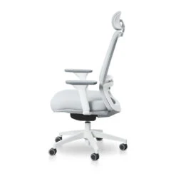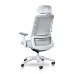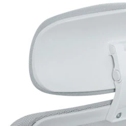 100% Polyester upholstered and polypropylene seat Foam cushioning with soft medium firmness Gas-lift for adjustable height and 360º swivel Removable arm and headrests Full black and white color-coated legs 5x nylon caster wheels on each leg Cloud Grey with white base Mesh fabric backrest Weight Capacity: 120 kg Product is flat packed and requires 2-person assembly