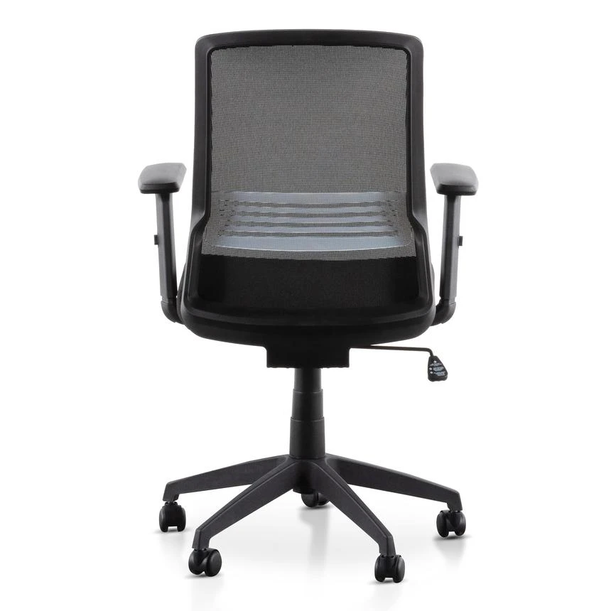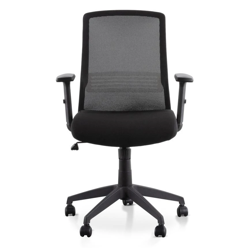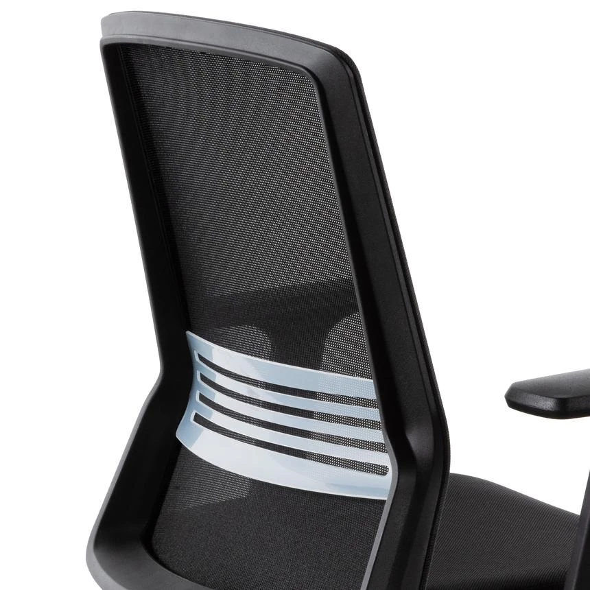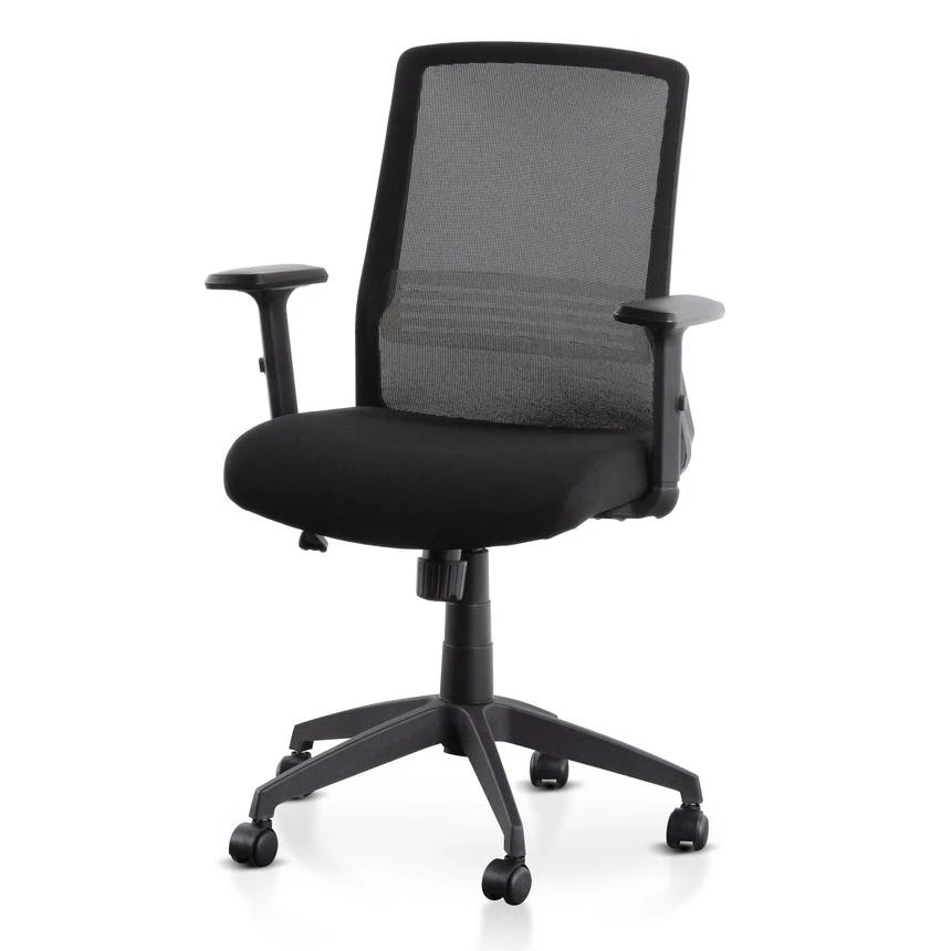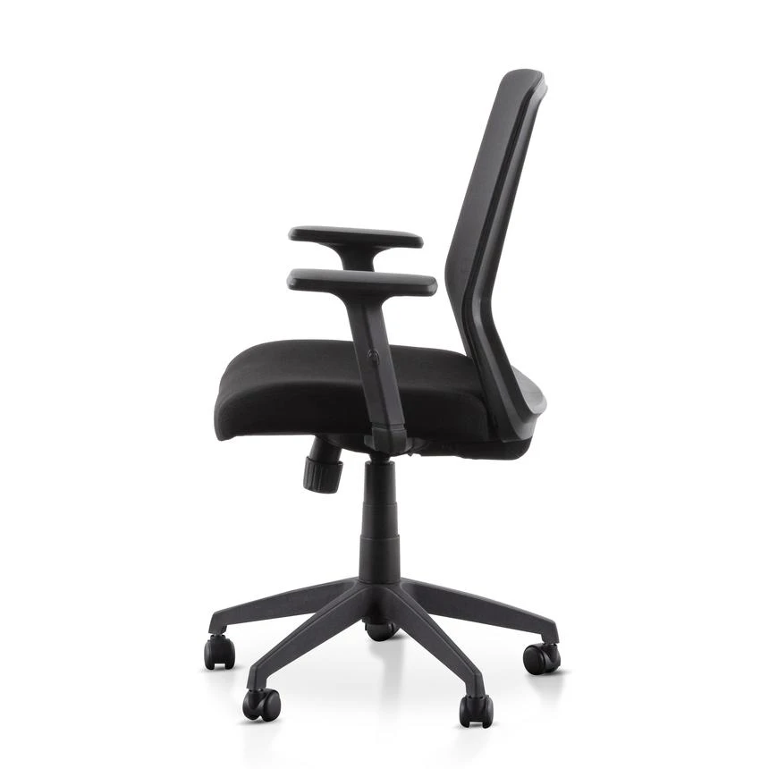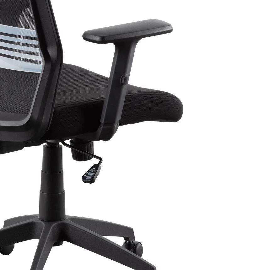 Ratchet back in breathable mesh upholstery Moulded and contoured frame and seat in polypropylene construction Waterfall seat rest in fabric upholstery with high-density foam insert Heavy duty nylon castor wheels with powder black finish Tilting mechanism with one point lock Tension and arm adjustment included 360 degree swivel with adjustable gas-lift seat height Product is flat packed and requires two-man assembly
