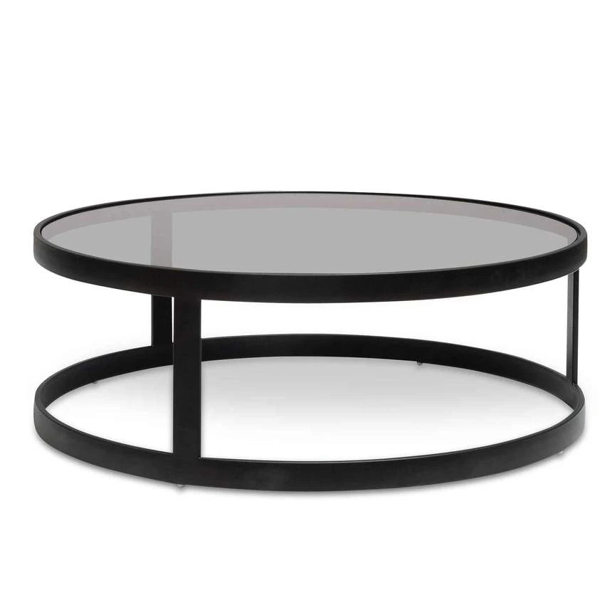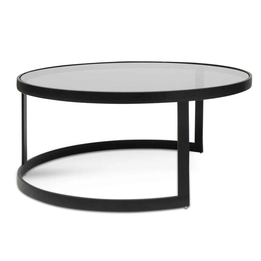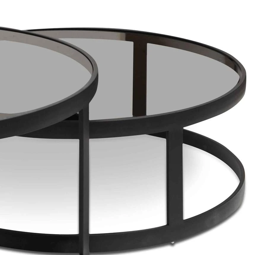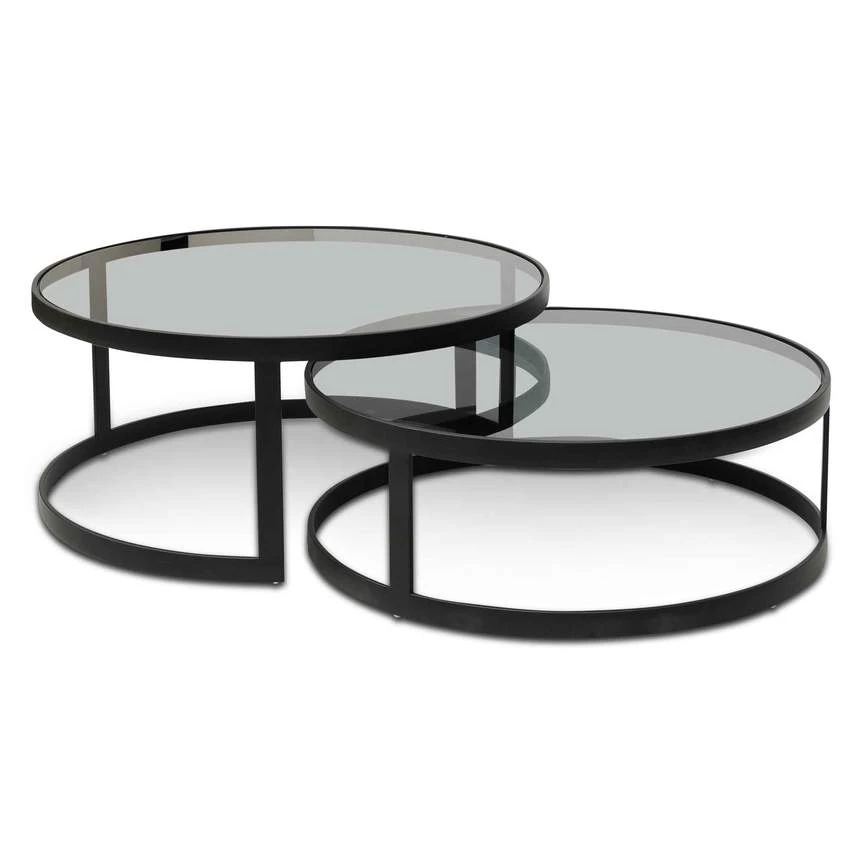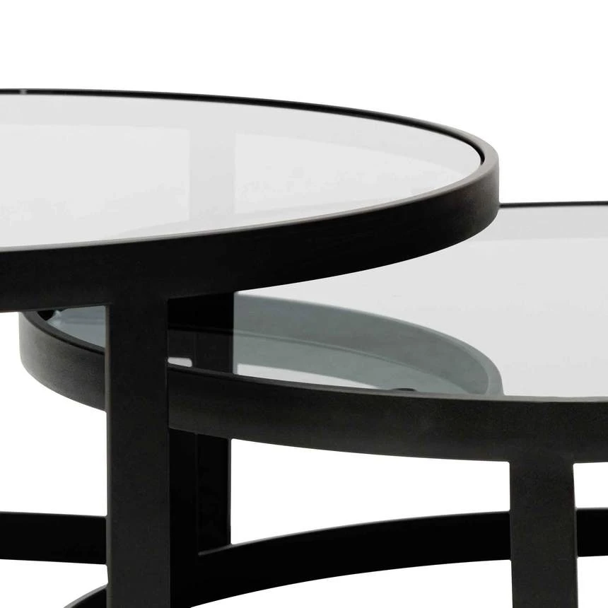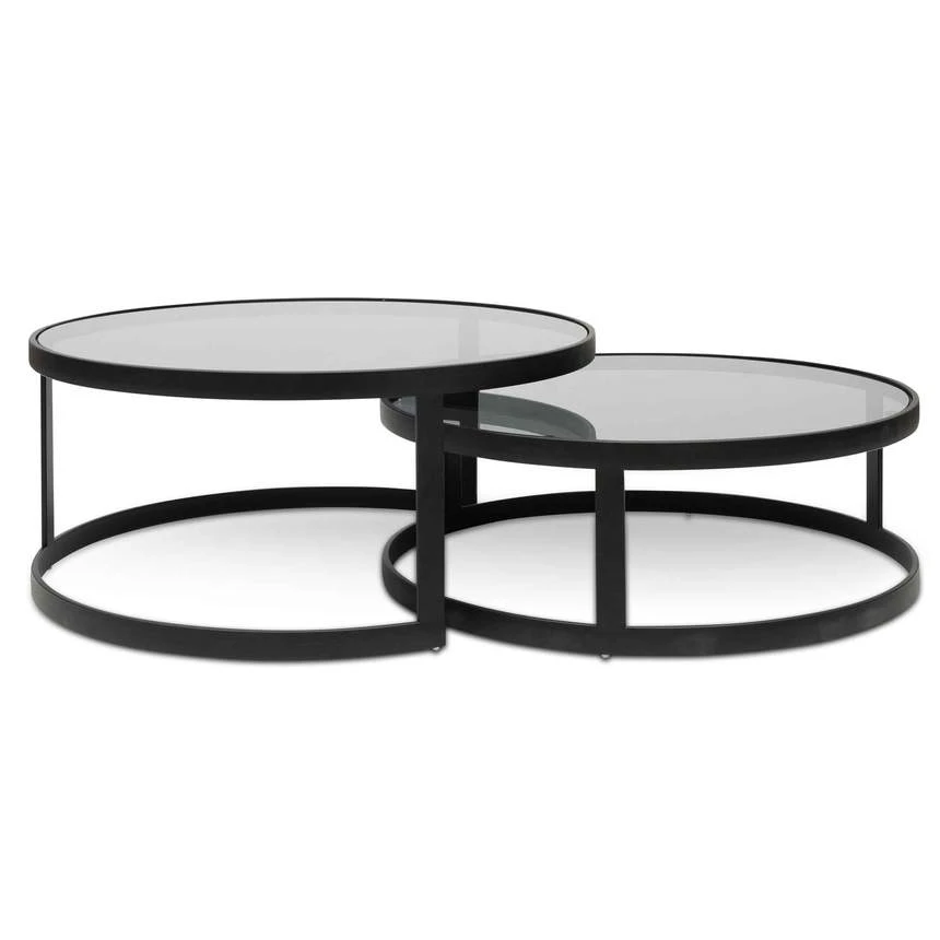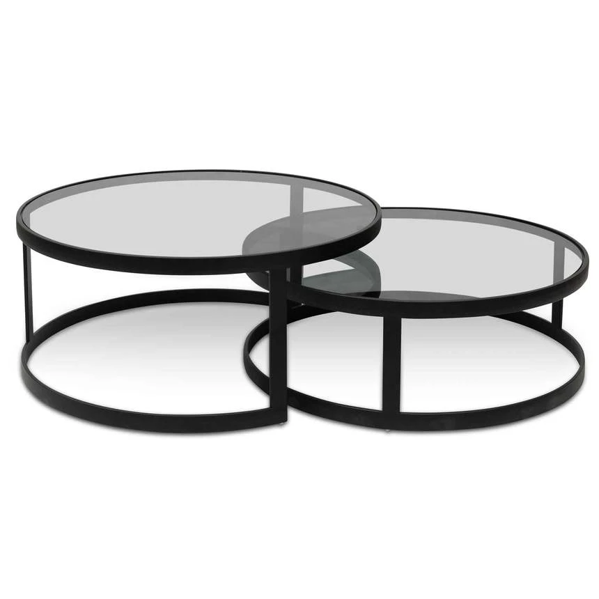 Tempered glass in a polished and tinted finish Steel frame construction in matte black Circular nest tables in a compact size Linear base featuring an open silhouette and with each boasting a different design Applicable for layering or showcasing one on its own Minor assembly required