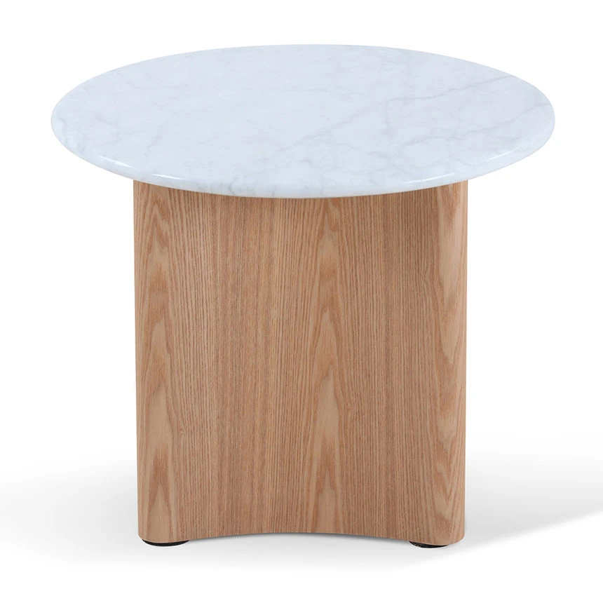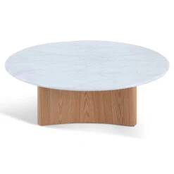 Engineered wood with ash mountain grain veneer Triangular-shaped curved legs Real marble tabletop with grey veins Natural wood finish base Compact round design with generous size Product requires minor assembly Note: Melbourne pick-up and delivery only