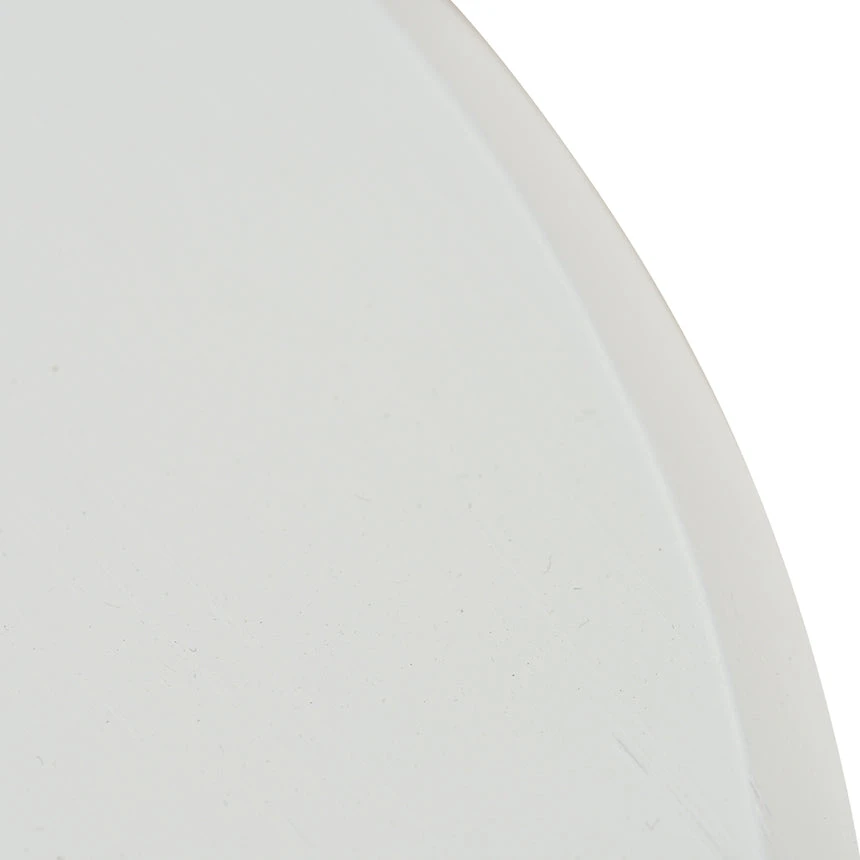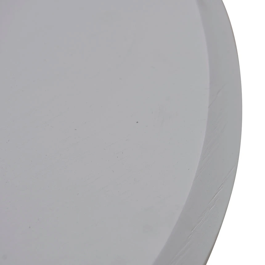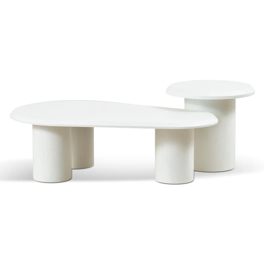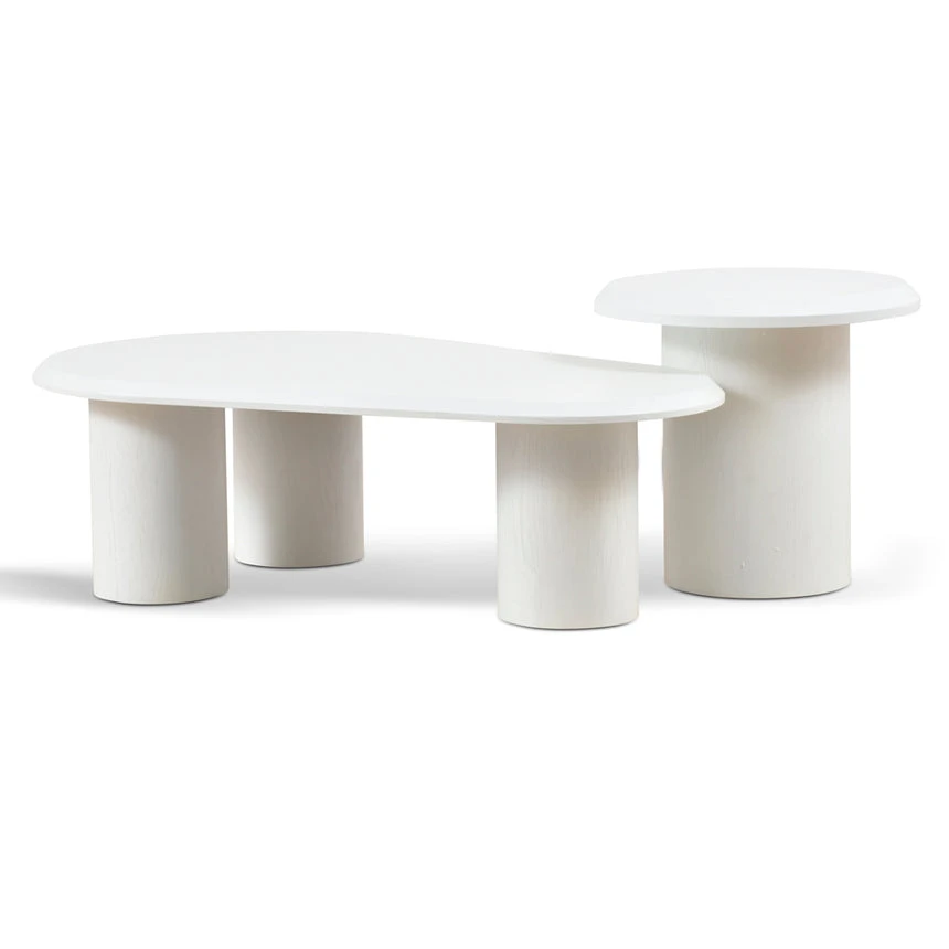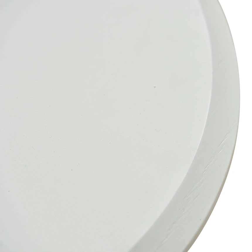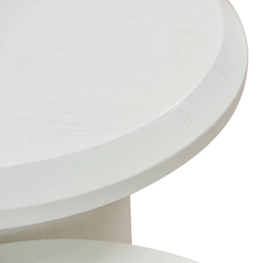 Engineered wood with veneer construction Geometrically structured nested design Complete white finish Cylindrical base Spacious tabletop for display Wood grain texture Weight Capacity: 30 kg Minor assembly required