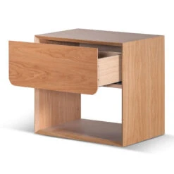 Engineered wood construction Rectangular drawer with curved bottom edge Deep wood textures throughout Complete matte natural finish Minimal with cut-out design 1x drawer on smooth metal rail Weight limit of 15kg Product comes fully assembled Note: Product is not suitable for commercial use.