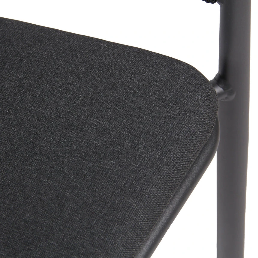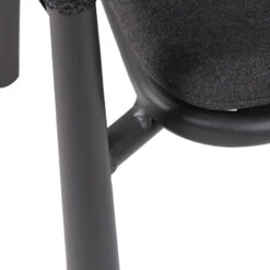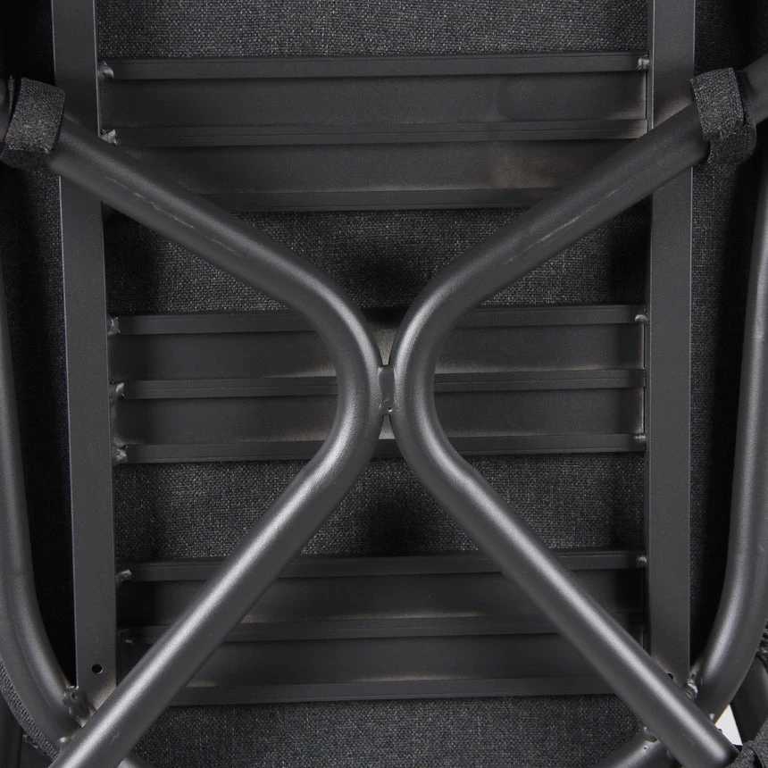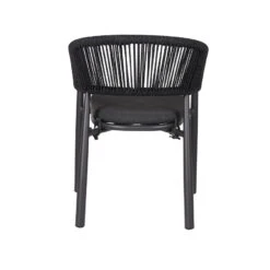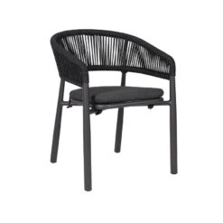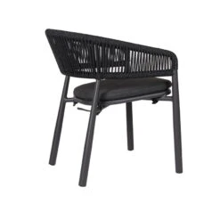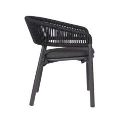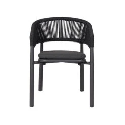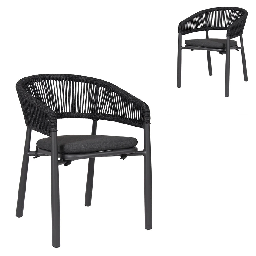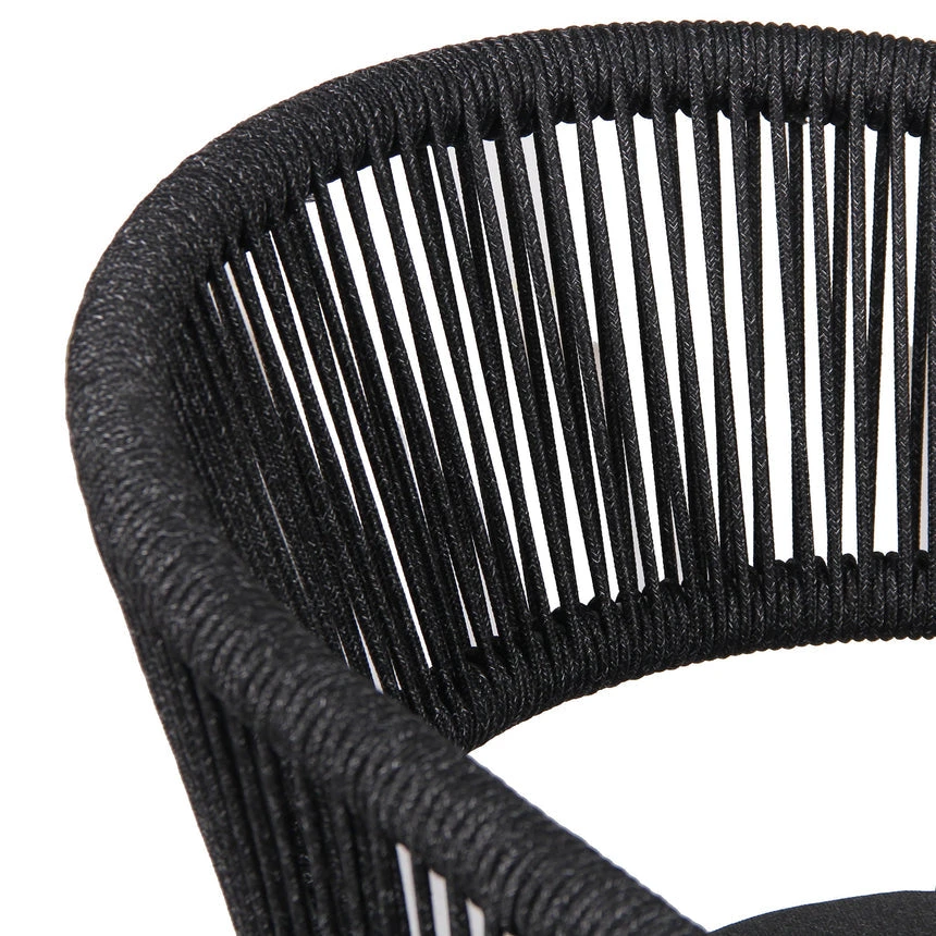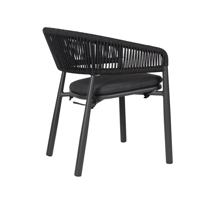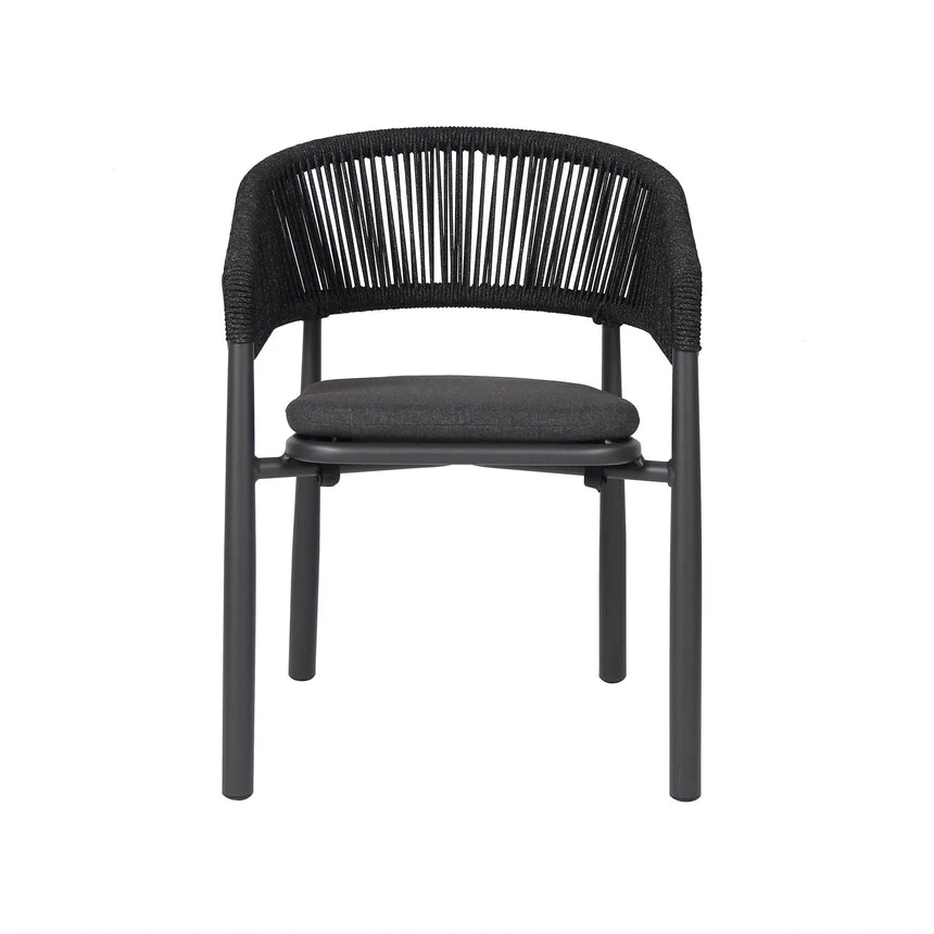 Charcoal polyester fabric upholstery Aluminum frame and legs 6mm light grey rope seat Rope with spandex polyester core Outer layer of rope; UV-resistant plastic and high-strength yarn 4cm thick cushioned seat with foam filling Soft-to-medium seat firmness Curved backrest and armrests Versatile tones suit any outdoor decor Weight Capacity: 200 kg Product comes fully assembled