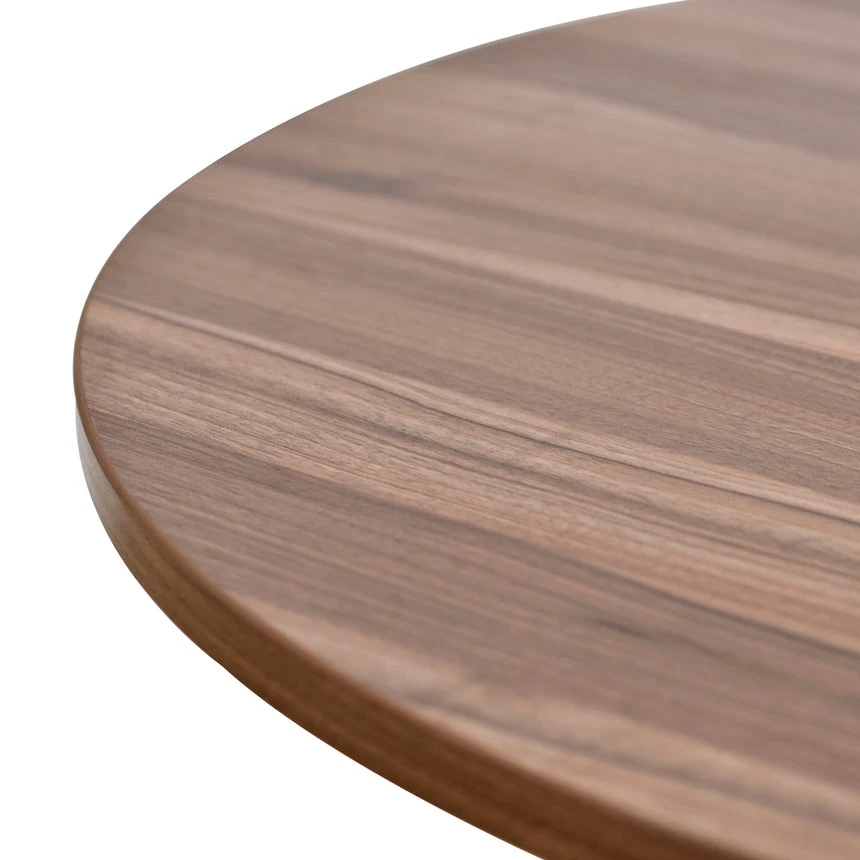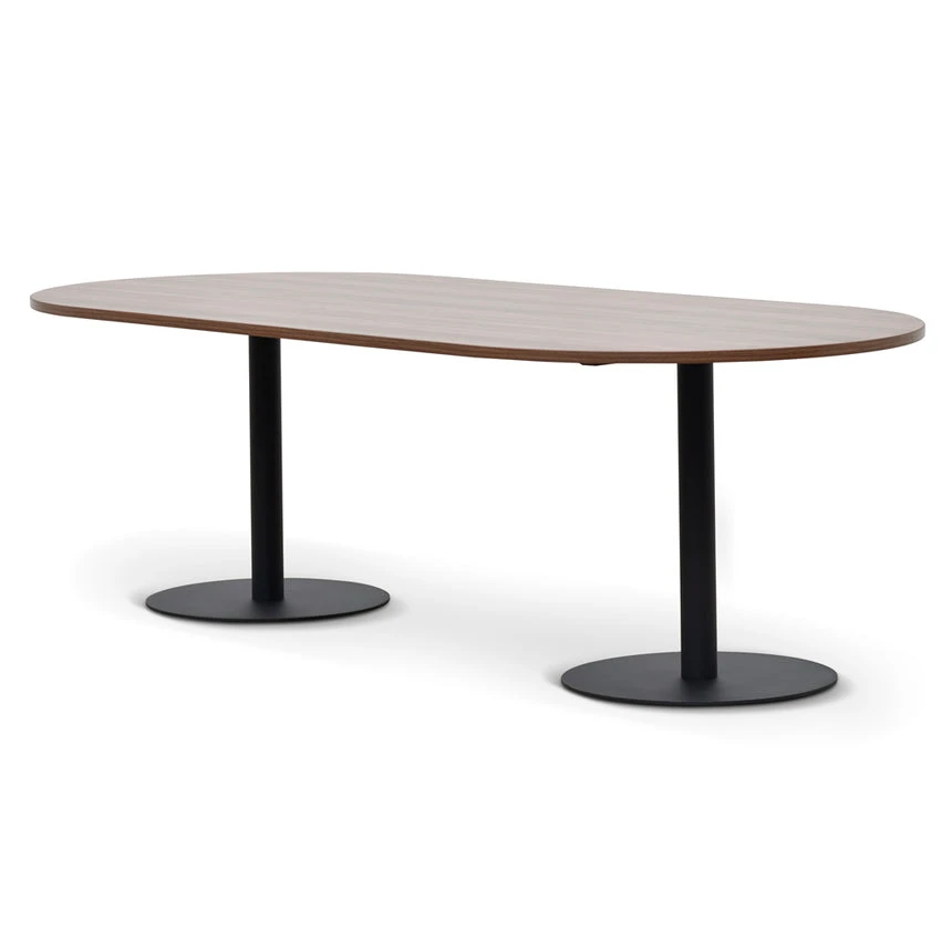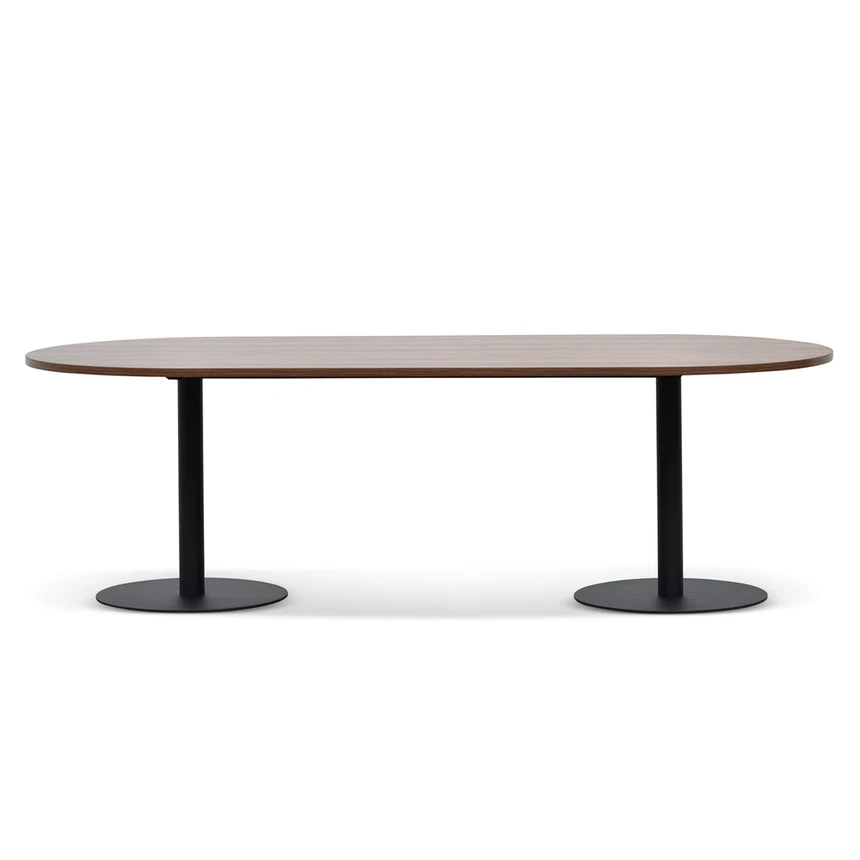 Melamine particle board top Oval-shaped table, 2.4 meters long Walnut finish Wood grain patterns 3 matte black steel legs Modern minimalist style Suitable for commercial use Weight Capacity: 200 kg Product is flatpack and requires two-person assembly