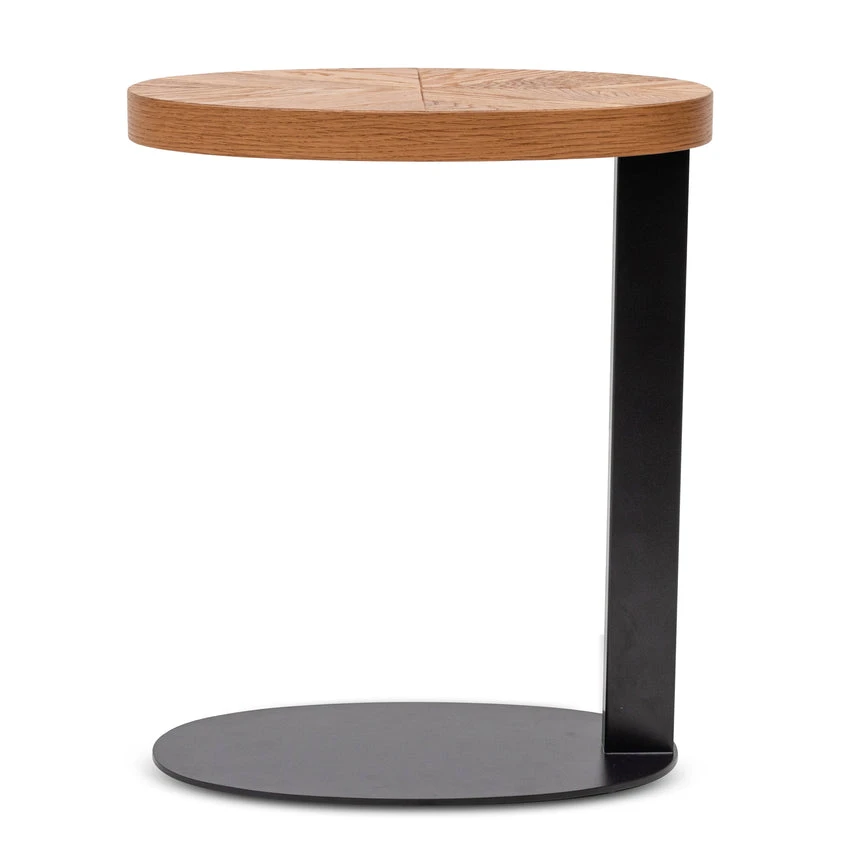 Rustic oak thin wood pattern oval top Thin single stand with oval base Powder coated in peppercorn metal frame Products come as flat pack