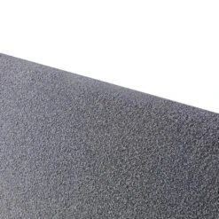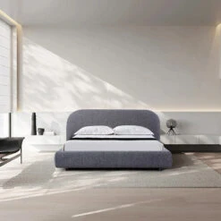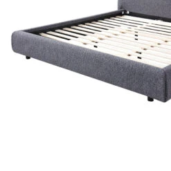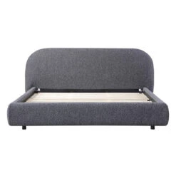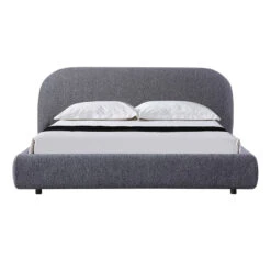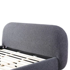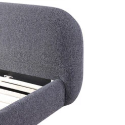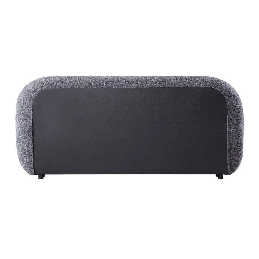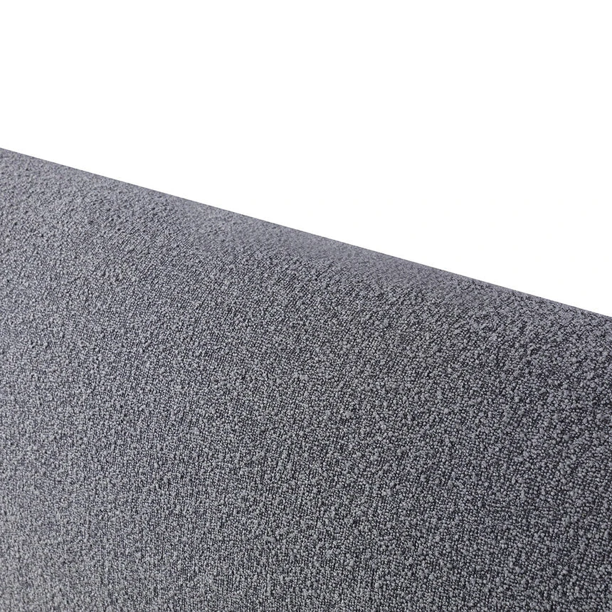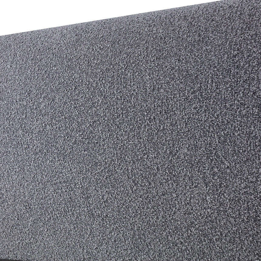 Upholstered in a 100% polyester Charcoal Pepper Boucle finish Frame made of engineered wood Thick plush headboard with round corners High-density foam inserts 4x round matte black legs with floor protectors Sturdy bed frame slats equipped with strong center support rails 350kg weight capacity Suitable for commercial use Product comes flat pack and requires two-person assembly with electric drill Note:King size pictured