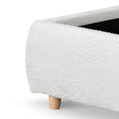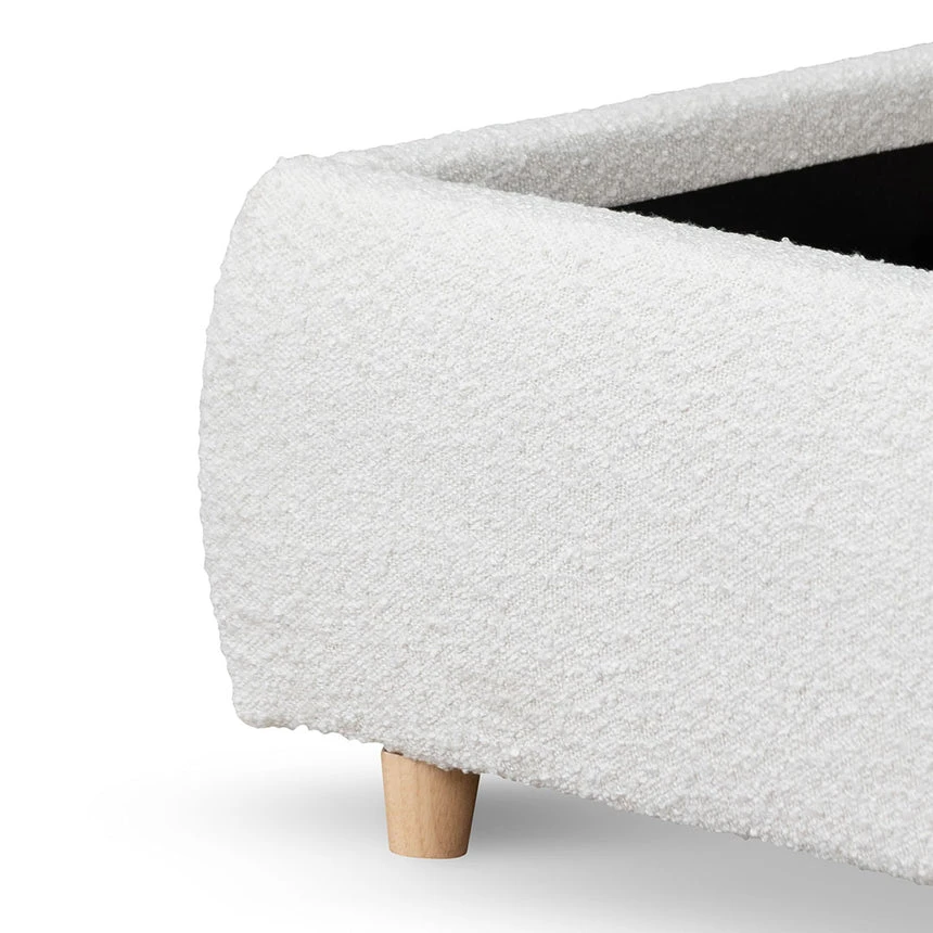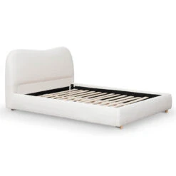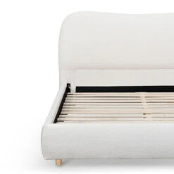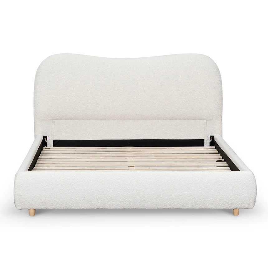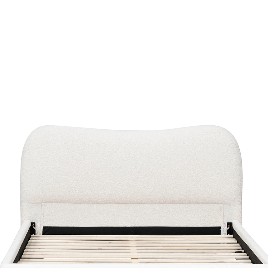 Made with engineered wood 100% polyester fabric in Cream White Boucle Accommodates a queen 153cm x 203cm mattress Wooden straight slats in an urban edge style 300kg weight limit Product comes flatpack and requires electric drill and two person for assembly